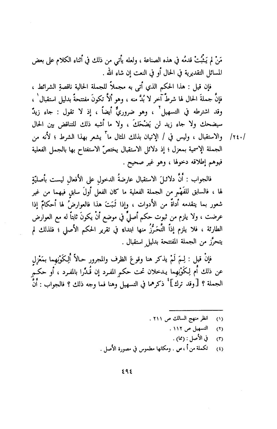 فإن قيل: هذا الحكم الذي أتى به مجملًا للجملة الحالية ناقصة الشرائط، فإن جملة الحال لها شرط آخر لابد منه، وهو ألا تكون مفتتحة بدليل استقبال، وقد اشترطه في التسهيل، وهو ضروري أيضًا، إذ لا تقول: جاء زيد سيضحك ولا جاء زيد لمن يضحك، ولا ما أشبه ذلك للتناقض بين الحال /240/ والاستقبال، وليس في/ الإتيان بذلك المثال ما يشعر بهذا الشرط؛ لأنه من الجملة الاسمية بمعزل؛ إذ دلائل الاستقبال يختص الاستفتاح بها الجملة الفعلية فيوهم إطلاقه دخولها، وهو غير صحيح.