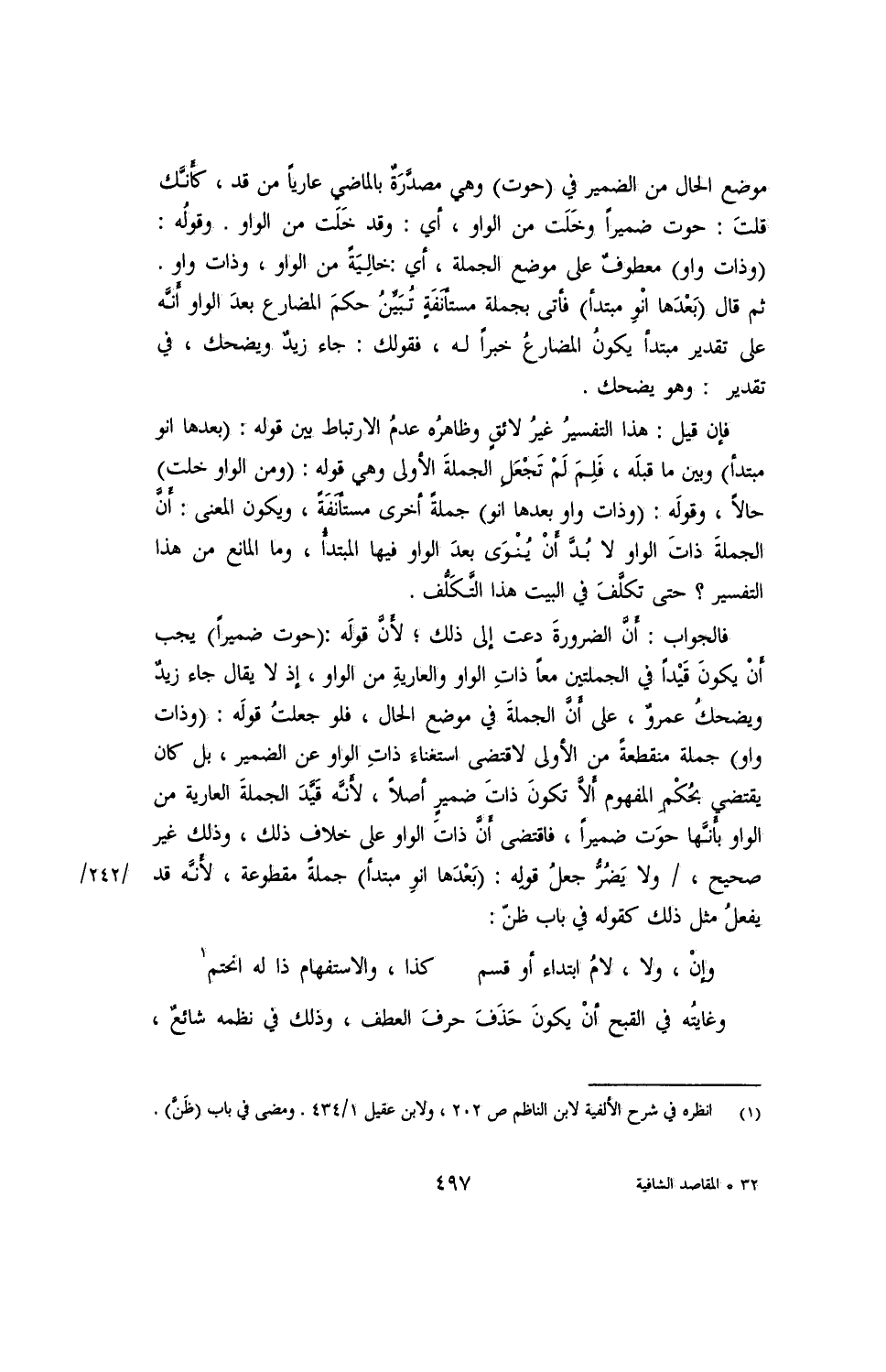 فالجواب: أن الضرورة دعت إلى ذلك؛ لأن قوله: (حوت ضميرًا) يحب أن يكون قيدًا في الجملتين معًا ذات الواو والعارية من الواو، إذ لا يقال جاء زيد ويضحك عمرو، على أن الجملة في موضع الحال، فلو جعلت قوله: (وذات واو) جملة منقطعة من الأولى لاقتضى استغناء ذات الواو عن الضمير، بل كان يقتضي بحكم المفهوم ألا تكون ذات ضمير أصلًا، لأنه قيد الجملة العارية من الواو بأنها حوت ضميرًا، فاقتضى أن ذات الواو على خلاف ذلك، وذلك غير صحيح، / ولا يضر جعل قوله: (بعدها انو مبتدأ) جملة مقطوعة، لأنه قد يفعل مثل ذلك كقوله في باب ظن: