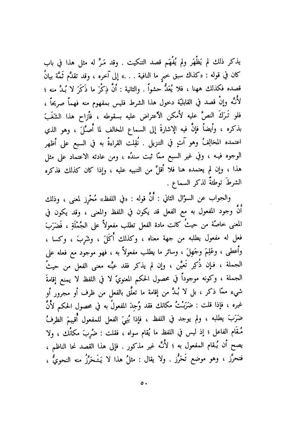 والجواب عن السؤال الثاني: أنّ في قوله: ((في اللفظ)) مُحرز لمعنى, وذلك أنّ وجود المفعول به مع الفعل قد يكون في اللفظ والمعنى, وقد يكون في المعنى خاصة من حيث كانت مادة الفعل تطلب مفعولًا على الجملة, فضربَ فعل له مفعول يطلبه من جهة معناه, وكذلك أكلَ, وشربَ, وكسا, وأعطَى, وعلِمَ وجهلَ, وسائر ما يطلب مفعولًا به, فهو موجود مع فعله على الجملة, فإن ذُكر تعيّن, وإن لم يذكر فقد عيّنه معنى الفعل من حيث الجملة, وكونه موجودًا في محصول الحكم المعنوي لا في اللفظ لا يمنع إقامة شيء مما ذكر, بل لابد من إقامة ما تعلق بالفعل من ظرف أو مجرور أو غيره, فإذا قلت: ضربْتُ مكانك فقد وُجدَ المفعول به في محصول الحكم لأن ضَرَبَ يطلبه, ولم يوجد في اللفظ, فإذا بُنيَ الفعل للمفعول اُقيمَ الظرفُ مُقام الفاعل؛ إذ ليس في اللفظ ما يُقام سواه, فقلت: ضُربَ مكانُك, ولا يصح أن يقام المفعول به؛ لأنّه غير مذكور. فإلى هذا القصد نحا الناظم, فتحرّز, وهو موضع تحرُّز. ولا يقال: مثلُ هذا لا يتحرّز منه النحوي,