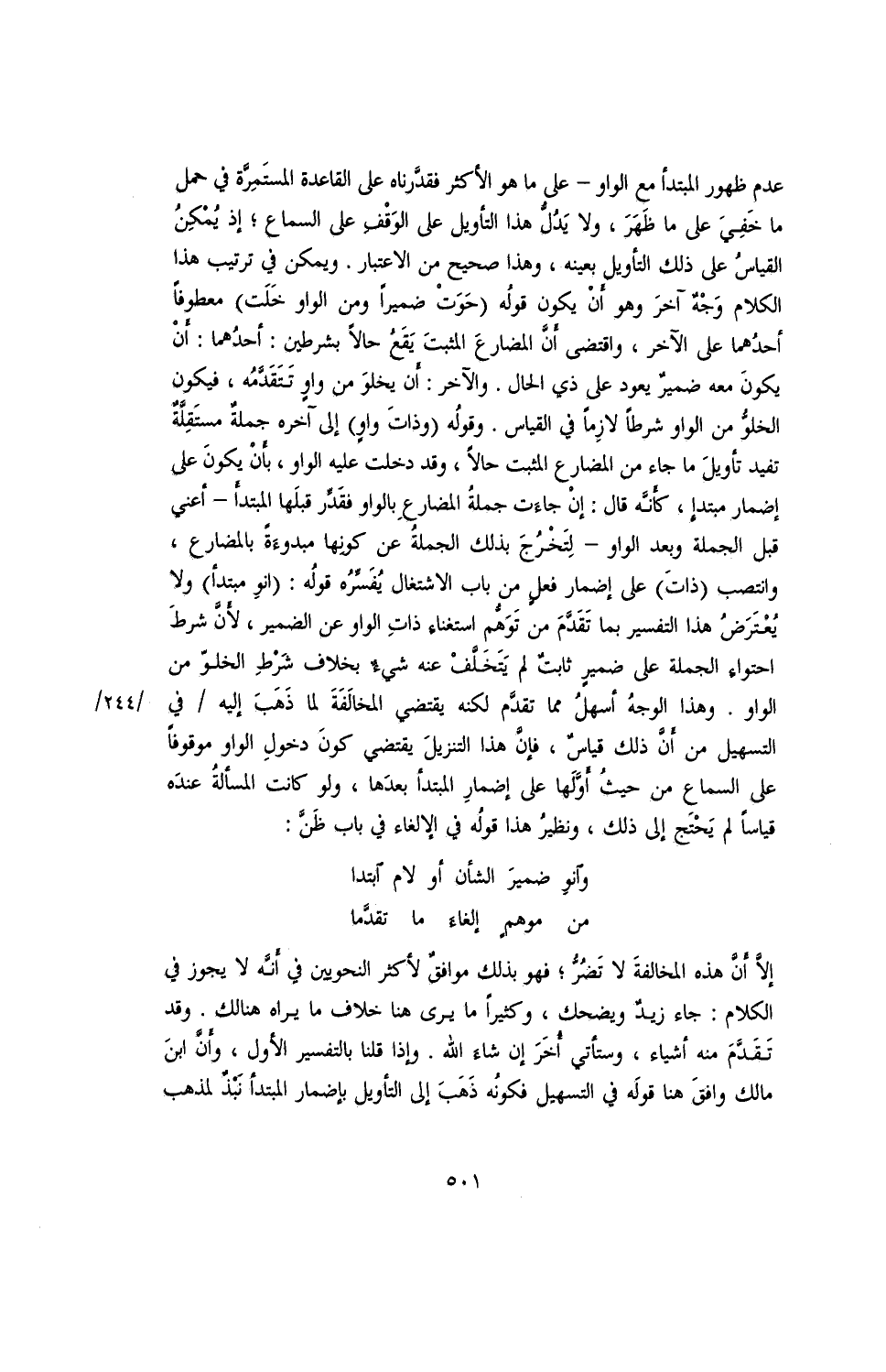 إلا أن هذه المخالفة لا تضر؛ فهو بذلك موافق لأكثر النحويين في أنه لا يجوز في الكلام: جاء زيد ويضحك، وكثيرًا ما يرى هنا خلاف ما يراه هنالك. وقد تقدم منه أشياء، وستأتي أخر غن شاء الله. وإذا قلنا بالتفسير الأول، وأن ابن مالك وافق هنا قوله في التسهيل فكونه ذهب إلى التأويل بإضمار المبتدأ نبذ لمذهب