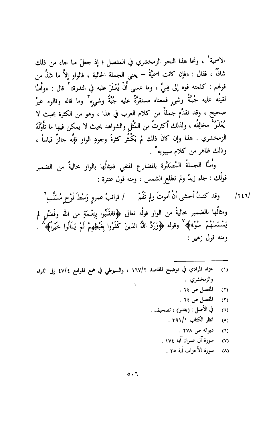 وأما الجملة المصدرة بالمضارع المنفي فمثالها بالواو خالية من الضمير قولك: جاء زيد ولم تطلع الشمس، ومنه قول عنترة: