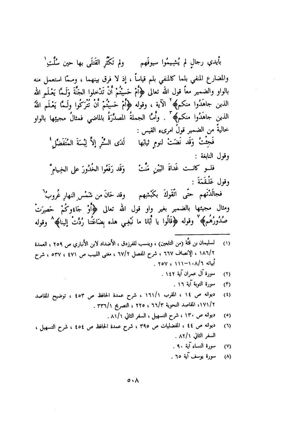 والمضارع المنفي بلما كالمنفي بلم قياسًا، إذ لا فرق بينهما، ومما استعمل منه بالواو والضمير معًا قول الله تعالى {أم حسبتم أن تدخلوا الجنة ولما يعلم الله الذين جاهدوا منكم} الآية، وقوله {أم حسبتم أن تتركوا ولما يعلم الله الذين جاهدوا منكم}. وأما الجملة المصدرة بالماضي فمثال مجيئها بالواو خالية من الضمير قول امرئ القيس: