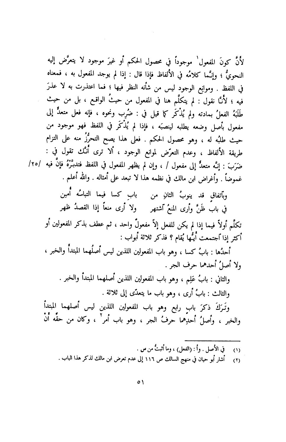 لأنّ كون المفعول موجودًا في محصول الحكم أو غير موجود لا يتعرّض إليه النحويّ؛ وإنمّا كلامُه في الألفاظ فإذا قال: إذا لم يوجد المفعول به, فمعناه في اللفظ. وموانع الوجود ليس من شأنه النظر فيها؛ فما اعتذرت به لا عذر فيه؛ لأنّا نقول: لم يتكلّم هنا في المفعول من حيث الواقع, بل من حيث طلبه الفعلُ بمادته ولم يُذكر كما قيل في: ضُرِبَ ونحوه, فإنّه فعل متعدٍّ إلى مفعول بأصل وضعه يطلبه لينصبه, فإذا لم بم يُذكر في اللفظ فهو موجود من حيث طلبه له, وهو محصول الحكم. فعلى عذا يصح التحرُز منه على التزام طريقة الألفاظ, وعدم التعرّض لموانع الوجود, ألا ترى أنّك تقول في: ضَرَبَ: أنه متعدّ إلى مفعول/, وإن لم يظهر المفعول في اللفظ فتدبّره فإنّ فيه غموضًا. وأغراض ابن مالك في نظمه هذا لا تبعد على أمثاله. والله أعلم.