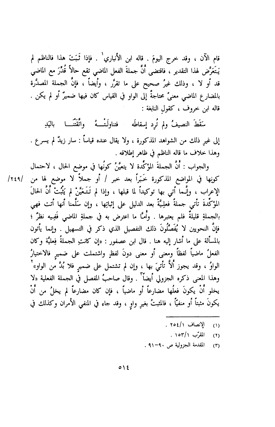 والجواب: أن الجملة المؤكدة لا يتعين كونها في موضع الحال، لاحتمال كونها في المواضع المذكورة خبرًا أو بعد خبر/ أو جملًا لا موضع لها من الإعراب، وإنما أتى بها توكيدًا لما قبلها، وإذا لم تتعين لم يثبت أن الحال المؤكدة تأتي جملة فعلية بعد الدليل على إثباتها، وإن سلمنا أنها أتت فهي بالجملة قليلة فلم يعتبرها. وأما ما اعترض به في جملة الماضي ففيه نظر؛ فإن النحويين لا يفصلون ذلك التفصيل الذي ذكر في التسهيل. وإنما يأتون بالمسالة على ما أشار إليه هنا. قال ابن عصفور: "إن كانت الجملة فعلية وكان الفعل ماضيًا لفظًا ومعنى أو معنى دون لفظ واشتملت على ضمير فالاختيار الواو، وقد يجوز ألا تأتي بها، وإن لم تشتمل على ضمير فلابد من الواو" وهذا المعنى ذكره الجزولي أيضًا. وقال صاحب المفصل في الجملة الفعلية "لا يخلو أن يكون فعلها مضارعًا أو ماضيًا، فإن كان مضارعًا لم يخل من أن يكون مثبتًا أو منفيًا، فالمثبت بغير واو، وقد جاء في المنفي الأمران وكذلك في