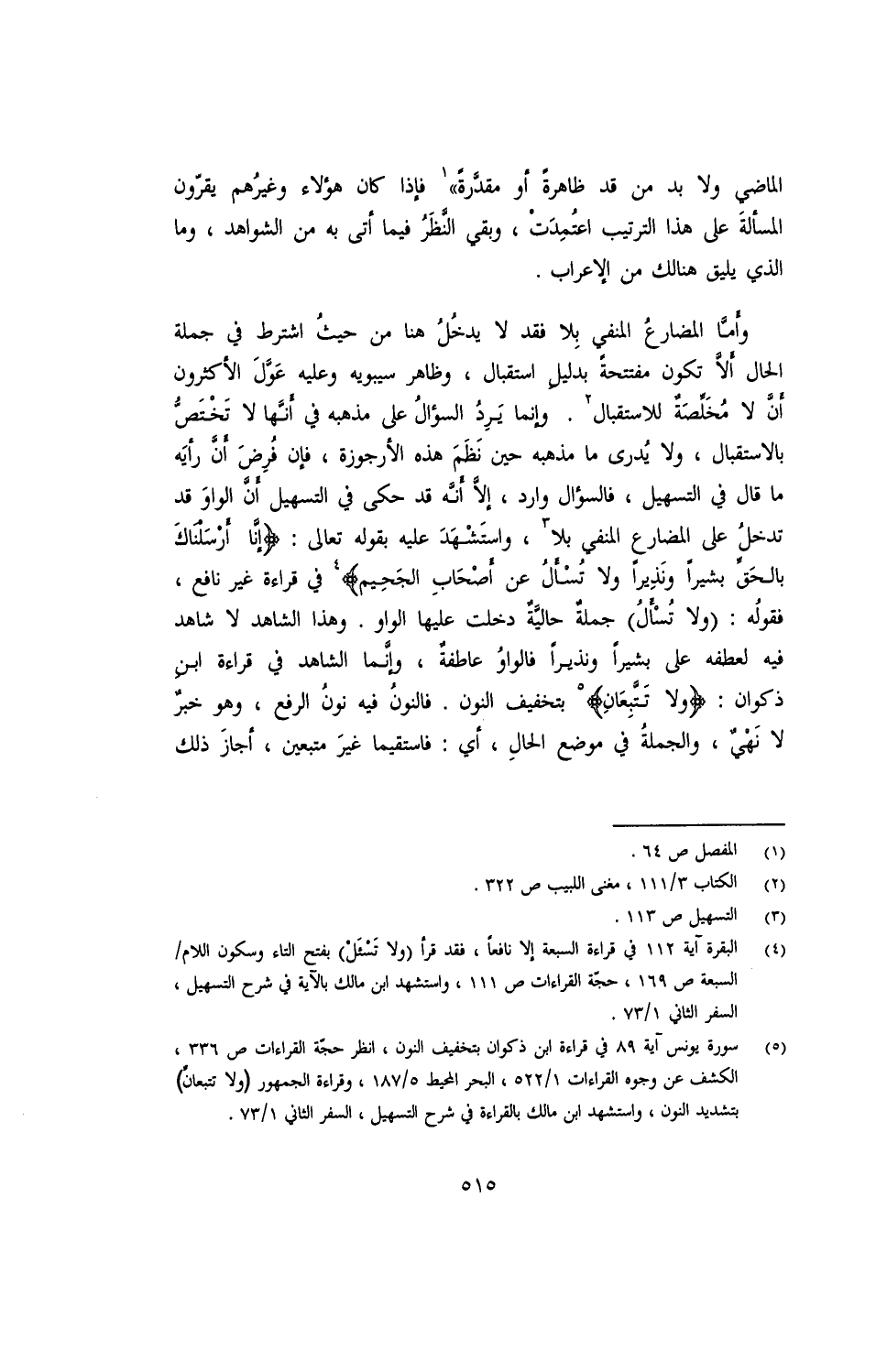 وأما المضارع المنفي بلا فقد لا يدخل هنا من حيث اشترط في جملة الحال ألا تكون مفتتحة بدليل استقبال، وظاهر سيبويه وعليه عول الأكثرون أن لا مخلصة للاستقبال. وإنما يرد السؤال على مذهبه في أنها لا تختص بالاستقبال، ولا يُدرى ما مذهبه حين نظم هذه الأرجوزة، فإن فُرض أن رأيه ما قال في التسهيل، فالسؤال وارد، إلا أنه حكى في التسهيل أن الواو قد تدخل على المضارع المنفي بلا، واستشهد عليه بقوله تعالى {إنا أرسلناك بالحق بشيرًا ونذيرًا ولا تسأل عن أصحاب الجحيم} في قراءة غير نافع، فقوله: (ولا تسأل) جملة حالية دخلت عليها الواو. وهذا الشاهد لا شاهد فيه لعطفه على بشيرًا ونذيرًا فالواو عاطفة، وإنما الشاهد في قراءة ابن ذكوان: {ولا تتبعان} بتخفيف النون. فالنون فيه نون الرفع، وهو خبر لا نهي، والجملة في موضع حال، أي: فاستقيما غير متبعين، أجاز ذلك