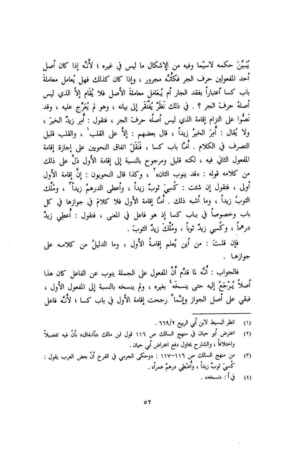يبيّن حكمه لاسيّما وفيه من الإشكال ما ليس في غيره؛ لأنّه إذا كان أصل أحد المفعولين حرف الجر فكانّه مجرور, وإذا كان كذلك فهل يُعامل معاملة باب كسا اعتبارًا بفقد الجار أم يُعامل معاملة الأصل فلا يُقام إلا الذي ليس أصله حرف الجر؟ . في ذلك نظرٌ يفتقر إلى بيانه, وهو لم يعرّج عليه, وقد نصّوا على التزام إقامة الذي ليس أصله حرف الجر, فتقول: أُمِر زيدٌ الخيرَ, ولا يقال: أُمِرَ الخيرُ زيدًا, قال بعضهم: إلّا على القلب, والقلب قليل التصرف في الكلام. أمّا باب كسا, فنقَل اتفاق النحويين على إجازة إقامة المفعول الثاني فيه, لكنه قليل ومرجوح بالنسبة إلى إقامة الأول دلّ على ذلك من كلامه: ((قد ينوب الثان)) , وكذا قال النحويون: إنّ إقامة الأول أولى, فتقول إن شئت: كُسيَ ثوبٌ زيدًا, وأعطي الدرهمُ زيدًا, ومُلِّك الثوبُ زيدًا, وما أشبه ذلك. أمّا إقامة الأول فلا كلام في جوازها في كل باب وخصوصًا في باب كسا إذ هو فاعل في المعنى, فتقول: أُعطِي زيدٌ درهمًا, وكثسِي زيدٌ ثوبًا, ومُلِّكَ زيدٌ الثوبَ.