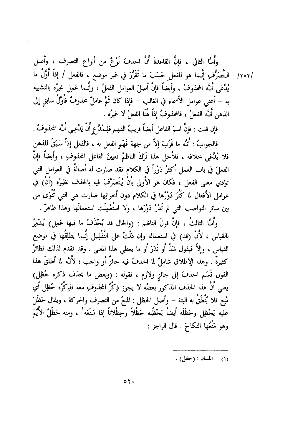 وأما الثالث: فإن قول الناظم: (والحال قد يحذف ما فيها عمل) يشعر بالقياس، لأن (قد) في استعماله وإن دلت على التقليل إنما يطلقها في موضع القياس، وإلا فيقول شذ أو ندر أو ما يعطي هذا المعنى. وقد تقدم لذلك نظائر كثيرة. وهذا الإطلاق شامل لما الحذف فيه جائز أو واجب؛ لأنه لما أطلق هذا القول قسم الحذف إلى جائز ولازم، فقوله: (وبعض ما يحذف ذكره حظل) يعني أن هذا الحذف المذكور بعضه لا يجوز ذكر المحذو معه فذكره حظل أي منع فلا ينطق به البتة- وأصل الحظل: المنع من التصرف والحركة، ويقال حظل عليه يحظل وحظله أيضًا يحظله حظلًا وحظلانًا إذا منعه، ومنه حظل الأيم وهو منعها النكاح. قال الراجز: