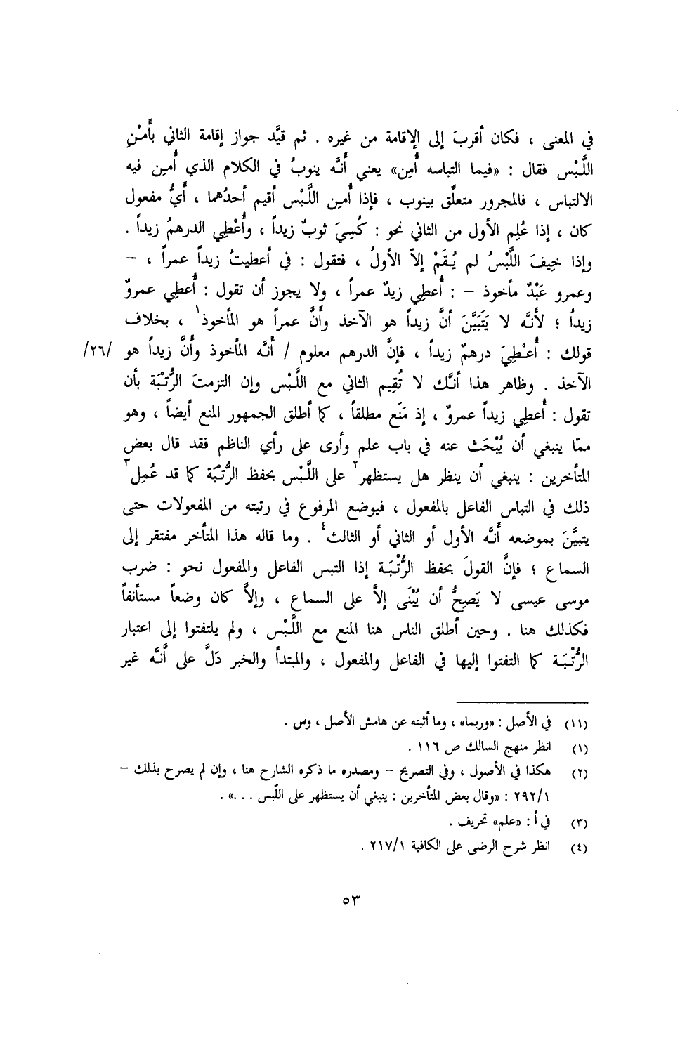 في المعنى, فكان أقربَ إلى الإقامة من غيره. ثمّ قيّد جواز إقامة الثاني بأَمْنِ اللّبس فقال: ((فيما التباسه أُمِن)) يعني أنّه ينوبُ في الكلام الذي أُمن فيه الالتباس, فالمجرور متعلّق بينوب, فإذا أمن اللبس أقيم أحدُهما, أيّ مفعول كام. وإذا عُلشم الأول من الثاني نحو: كُسِيَ ثوبٌ زيدًا, وأُعْطِيَ الدرهمُ زيدًا. وإذا خيفَ اللبسُ لم يُقَم إلا الأولُ, فتقول: في أعطيتُ زيدًا عمرًا, -وعمرو عبدٌ مأخوذ-: أعطِي زيدٌ عمرًا, ولا يجوز أن تقول: أُعطِي عمروٌ زيدُا؛ لأنه لا يتبين أنّ زيدًا هو الآخذ وأنّ عمرًا هو المأخوذ, بخلاف قولك: أُعطِيَ درهمٌ زيدًا, فإنّ الدرهم معلوم/ أنّه المأخوذ وأنّ زيدًا هو الآخذ. وظاهر هذا أنّك لا تُقيم الثاني مع اللّبس وإن التزمت الرُتبَة بأن تقول: أُعطِي زيدًا عمروٌ, إذ منع مطلقًا, كما أطلق الجمهور المنع أيضًا, وهو مما ينبغي أن يُبحث عنه في باب علم وأرى على رأي الناظم فقد قال بعض المتأخرين: ينبغي أن ينظر هل يستظهر على اللّبس بحفظ الرُتبة كما قد عُمل ذلك في التباس الفاعل بالمفعول, فيوضع المرفوع في رتبته من المفعولات حتى يتبيّن بموضعه أنه الأول أو الثاني أو الثال. وما قاله هذا المتأخر مفتقر إلى السماع؛ فإن القول بحفظ الرُتبة إذا التبس الفاعل والمفعول نحو: ضرب موسى عيسى لا يصح أن يبنى إلا على السماع, وإلّا كان وضعًا مستأنفًا فكذلك هنا. وحين أطلق الناس هنا المنع مع اللّبس, ولم يلتفتوا إلى اعتبار الرُتبة كما التفتوا إليها في الفاعل والمفعول, والمبتدأ والخبر دلّ على أنّه غير