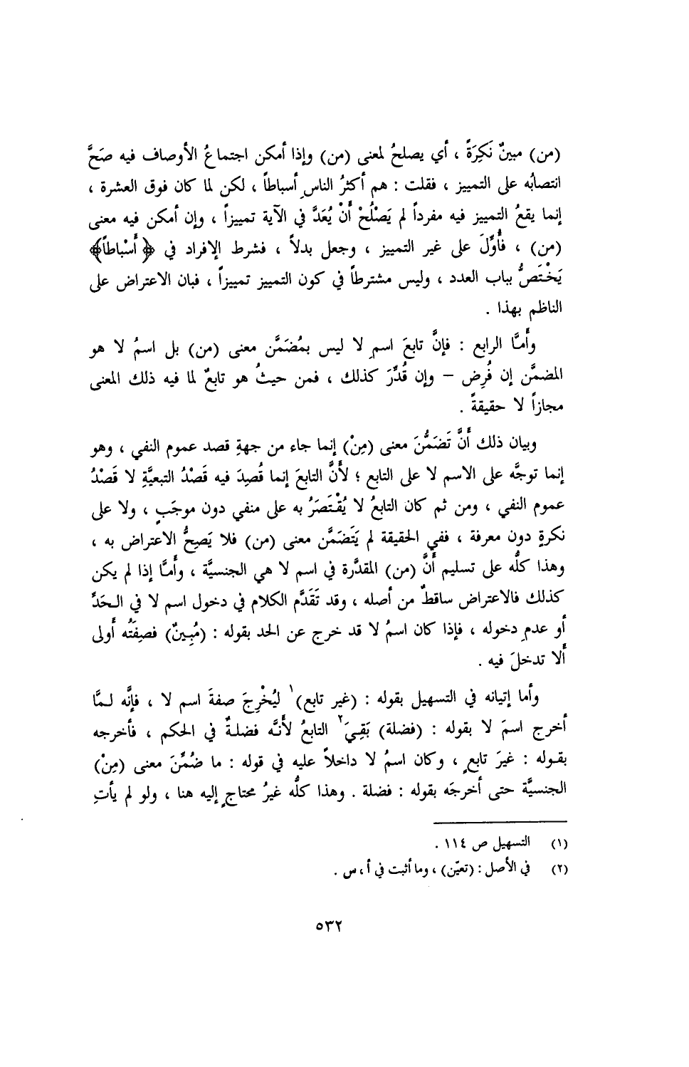 وأما إتيانه في التسهيل بقوله: (غير تابع) ليخرج صفة اسم لا، فإنه لما أخرج اسم لا بقوله: (فضلة) بقي التابع لأنه فضلة في الحكم، فأخرجه بقوله: غير تابٍع، وكان اسم لا داخلًا عليه في قوله: ما ضمن معنى (من) الجنسية حتى أخرجه بقوله: فضلة. وهذا كله غير محتاٍج إليه هنا، ولو لم يأت