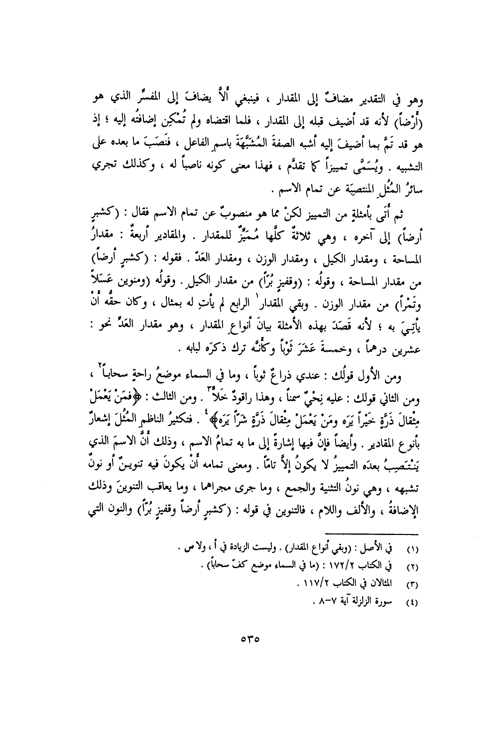 ومن الأول قولك: عندي ذراع ثوبًا، وما في السماء موضع راحٍة سحابًا، ومن الثاني قولك: عليه نحي سمنًا، وهذا راقود خلا. ومن الثالث: {فمن يعمل مقال ذرٍة خيرًا يره ومن يعمل مثقال درٍة شرًا يره}. فتكثير الناظم المثل إشعار بأنواع المقادير. وأيضًا فإن فيها إشارة إلى ما به تمام الاسم، وذلك أن الاسم الذي ينتصب بعده التمييز لا يكون إلا تامًا، ومعنى تمامه أن يكون فيه تنوين أو نون تشبهه، وهي نون التثنية والجمع، وما جرى مجراهما، وما يعاقب التنوين وذلك الإضافة، والألف واللام، فالتنوين في قوله: (كشبرٍ أرضًا وقفيزٍ برًا) والنون التي