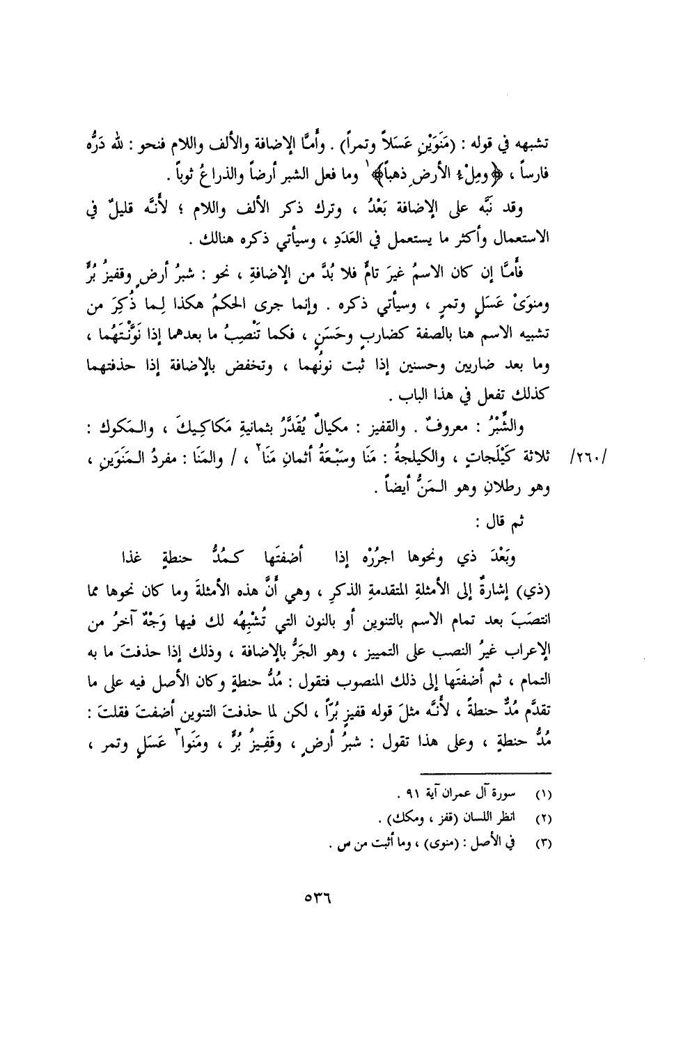 تشبهه في قوله: (منوين عسلًا وتمرًا). وأما الإضافة والألف فنحو: لله دره فارسًا، {وملء الأرض ذهبًا} وما فعل الشبر أرضًا والذراع ثوبًا.