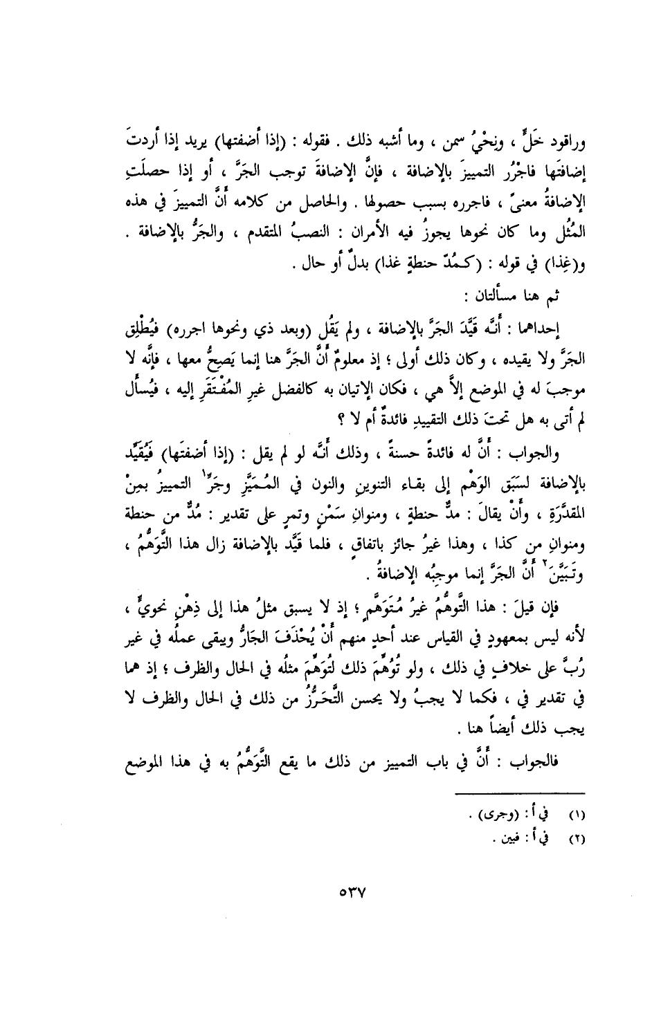 إحداهما: أنه قيد الجر بالإضافة، ولم يقل (وبعد ذي ونحوها أجرره) فيطلق الجر ولا يقيده، وكان ذلك أولى؛ إذ معلوم أن الجر هنا إنما يصح معها، فإنه لا موجب له في الموضع إلا هي، فكان الإتيان به كالفضل غير المفتقر إليه، فيسأل لم أتى به هل تحت ذلك التقييد فائدة أم لا؟