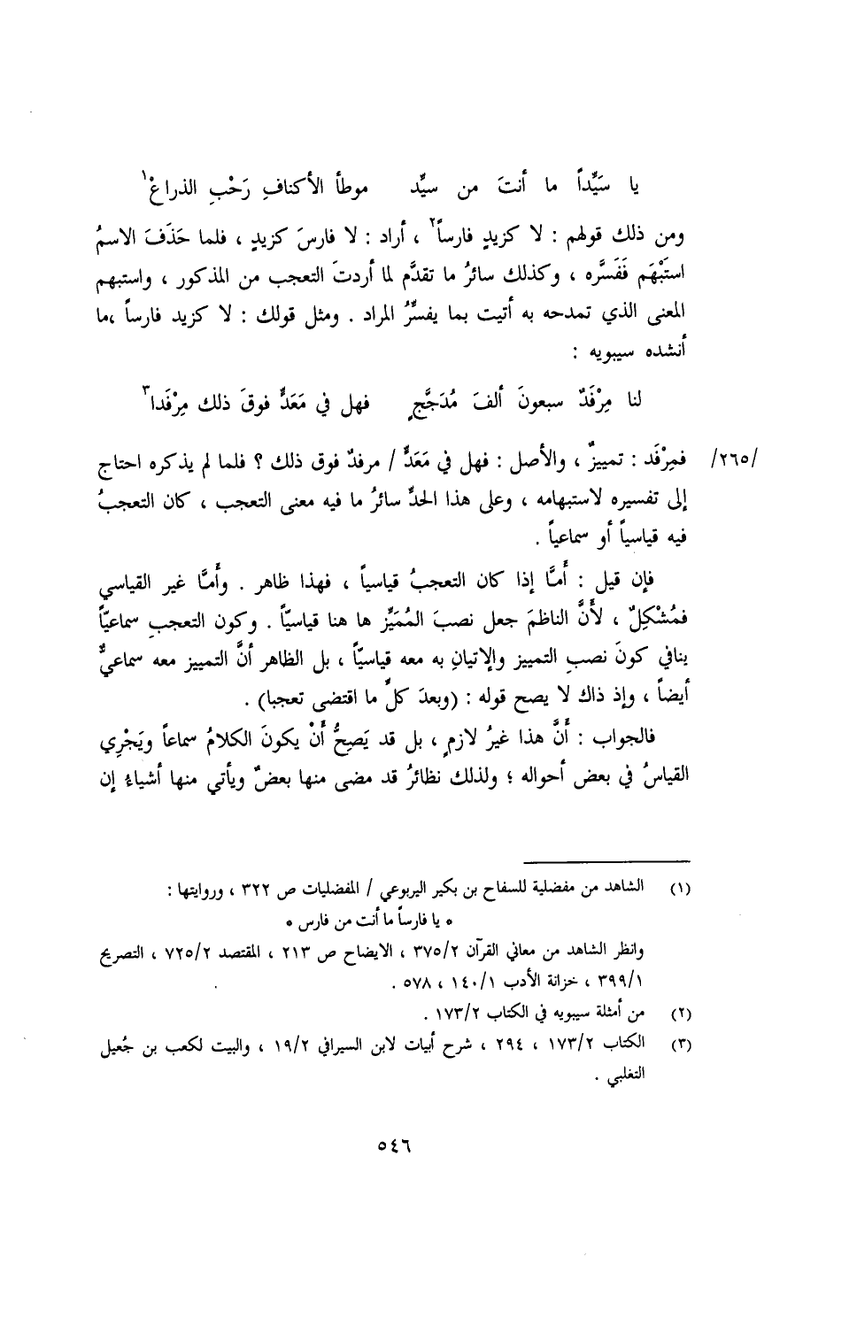 ومن ذلك قولهم: لا كزيٍد فارسًا، أراد: لا فارس كزيٍد، فلما حذف الاسم استبهم ففسره، وكذلك سائر ما تقدم لما أردت التعجب من المذكور، واستبهم المعنى الذي تمدحه أتيت بما يفسر المراد. ومثل قولك: لا كزيد فارسًا، ما أنشده سيبويه: