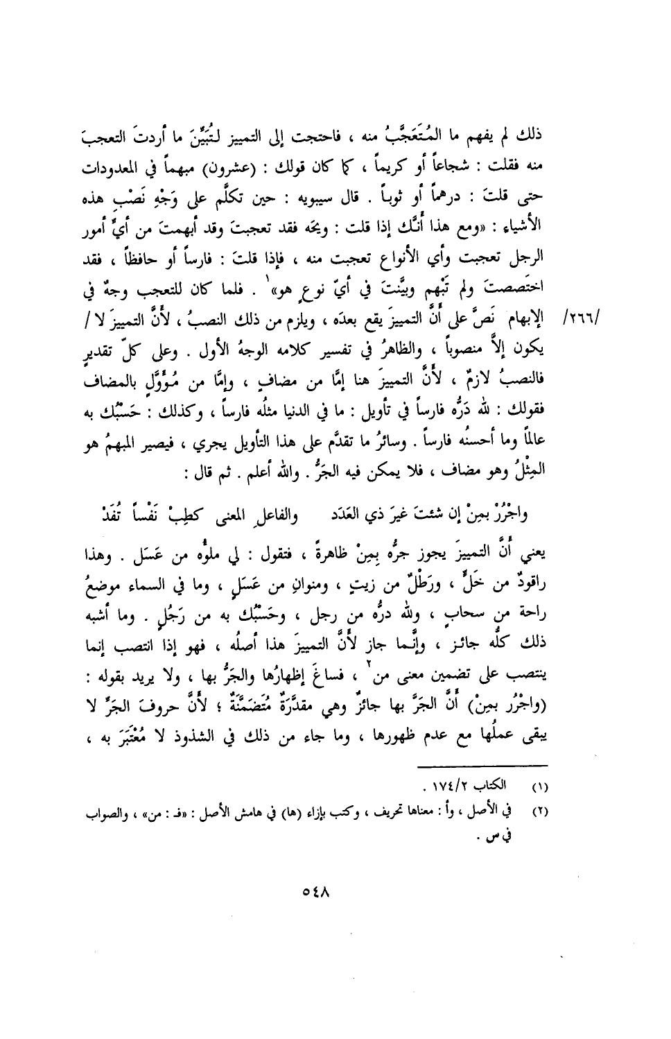 ذلك لم يفهم ما المتعجب منه، فاحتجت إلى التمييز لتبين ما أردت التعجب منه فقلت: شجاعًا أو كريمًا، كما كان قولك: (عشرون) مبهمًا في المعدودات حتى قلت: درهمًا أو ثوبًا. قال سيبويه: حين تكلم على وجه نصب هذه الأشياء: "ومع هذا أنك إذا قلت: ويحه فقد تعجبت وقد أبهمت من أي أمور الرجل تعجبت وأي الأنواع تعجبت منه، فإذا قلت: فارسًا أو حافظًا، فقد اختصصت ولم تبهم وبينت في أي نوٍع هو". فلما كان للتعجب وجه في الإبهام نص على أن التمييز يقع بعده، ويلزم من ذلك النصب، لأن التمييز لا/ يكون إلا منصوبًا، والظاهر في تفسير كلامه الوجه الأول. وعلى كل تقديٍر فالنصب لازم، لأن التمييز هنا إما من مضاٍف، وإما من مؤوٍل بالمضاف فقولك: لله دره فارسًا في تأويل: ما في الدنيا مثله فارسًا، وكذلك: حسبك به عالمًا وما أحسنه فارسًا. وسائر ما تقدم على هذا التأويل يجري، فيصير المبهم هو المثل وهو مضاف، فلا يمكن فيه الجر. والله أعلم. ثم قال: