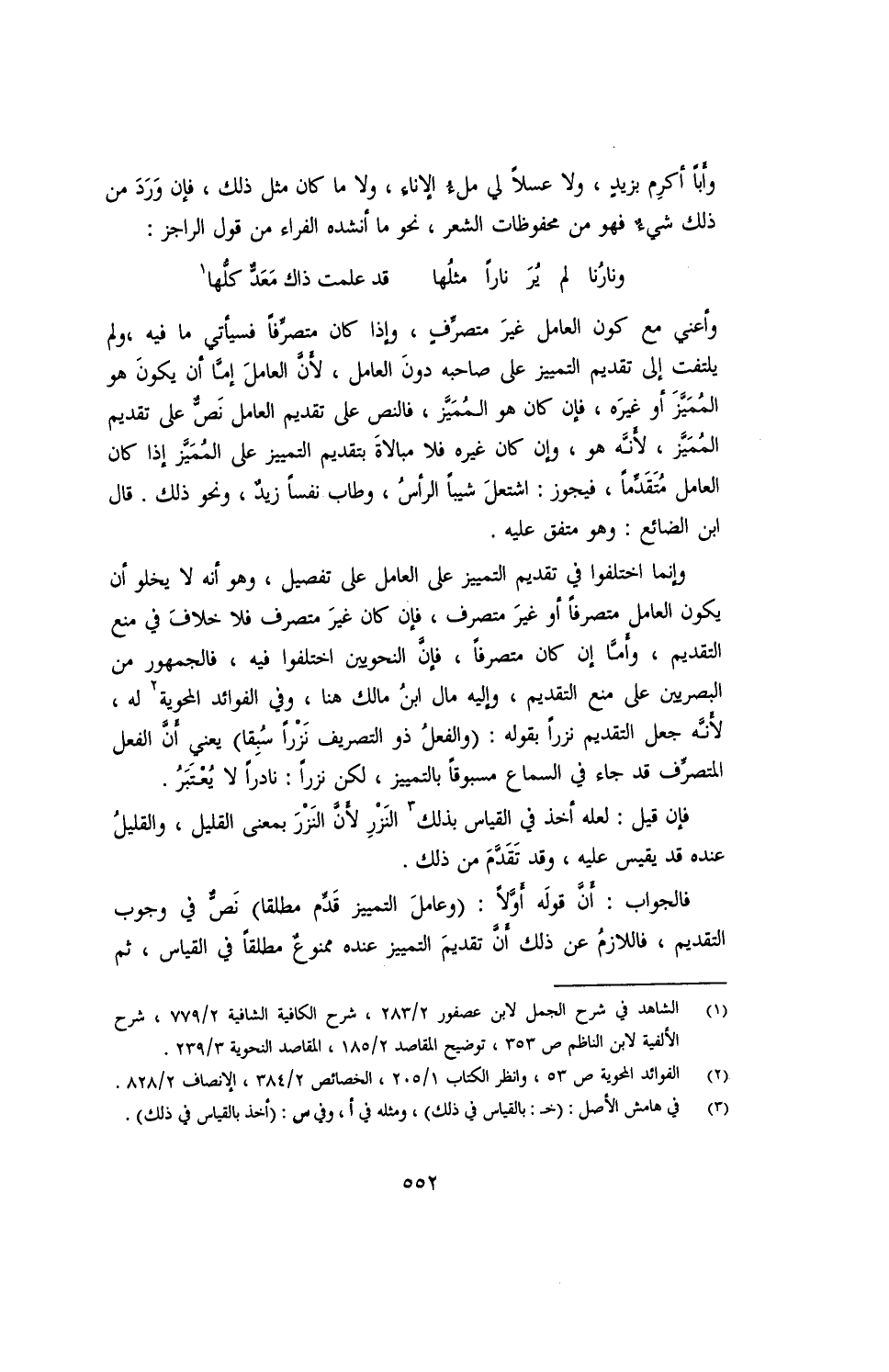 وإنما اختلفوا في تقديم التمييز على العامل على تفصيل، وهو أنه لا يخلو أن يكون العامل متصرفًا أو غير متصرف، فإن كان غير متصرف في خلاف في منع التقديم، وأما إن كان متصرفًا، فإن النحويين اختلفوا فيه، فالجمهور من البصريين على منع التقديم، وإليه مال ابن مالك هنا، وفي الفوائد المحوية له، لأنه جعل التقديم نزرًا بقوله: (والفعل ذو التصريف نزرًا سبقا) يعني أن الفعل المتصرف قد جاء في السماع مسبوقًا بالتمييز، لكن نزرًا: نادرًا لا يعتبر.