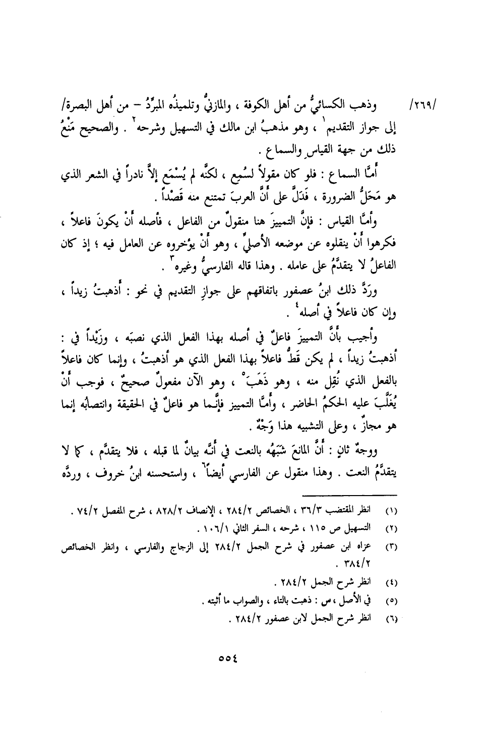 وذهب الكسائي من أهل الكوفة، والمازني وتلميذه المبرد - من أهل البصرة/ إلى جواز التقديم، وهو مذهب ابن مالك في التسهيل وشرحه. والصحيح منع ذلك من جهة القياس والسماع.