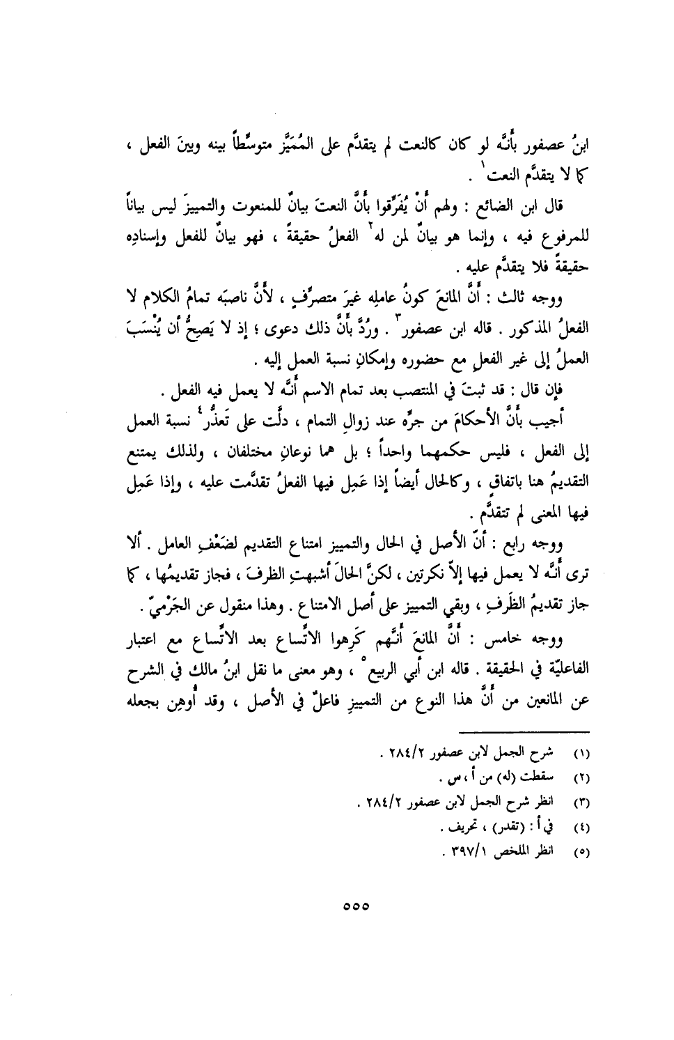 ووجه خامس: أن المانع أنهم كرهوا الاتساع بعد الاتساع مع اعتبار الفاعلية في الحقيقة. قاله بن أبي الربيع، وهو معنى ما نقل ابن مالك في الشرح عن المانعين من أن هذا النوع من التمييز فاعل في الأصل، وقد أوهن بجعله