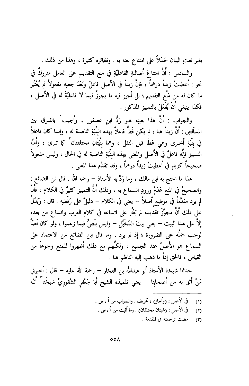 هذا ما احتج به ابن مالك، وما رد به الأستاذ - رحمه الله. قال ابن الضائع: والصحيح في المنع عدم ورود السماع به، وذلك أن التمييز كثير في الكلام، فإن لم يرد مقدمًا في موضع أصلًا - يعني في الكلام - دليل على رفضه. قال: ويدل على ذلك أن مجوز تقديمه لم يعثر على اتساعه في كلام العرب واتساع من بعده إلا على هذا البيت - يعني بيت المخبل - وليس بنص فيما زعموا، ولو كان نصًا لوجب حمله على الضرورة؛ إذ لم يرد. وما قال ابن الضائع من الاعتماد على السماع هو الأصل عند الجميع، ولكنهم مع ذلك أظهروا للمنع وجوهًا من القياس، فالحق إذا ما ذهب إليه الناظم هنا.