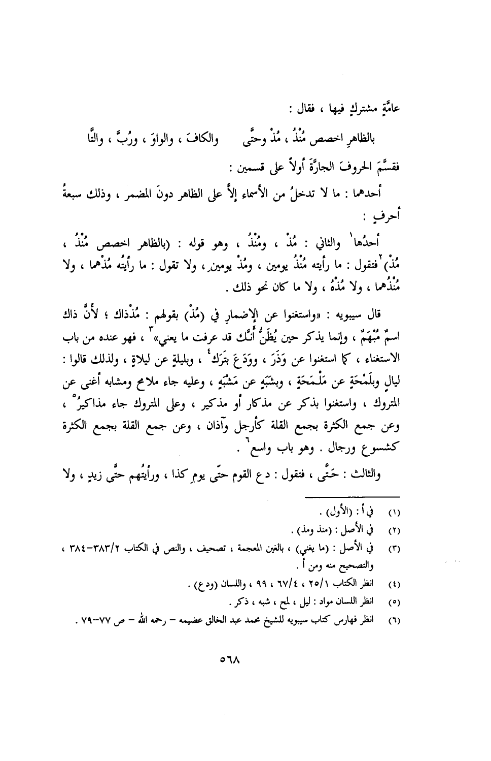 أحدها والثاني: مذ، ومنذ، وهو قوله: (بالظاهر اخصص منذ، مذ) فتقول: ما رأيته منذ يومين، ومذ يومين، ولا تقول: ما رأيته مذهما، ولا منذهما، ولا مذه، ولا ما كان نحو ذلك.