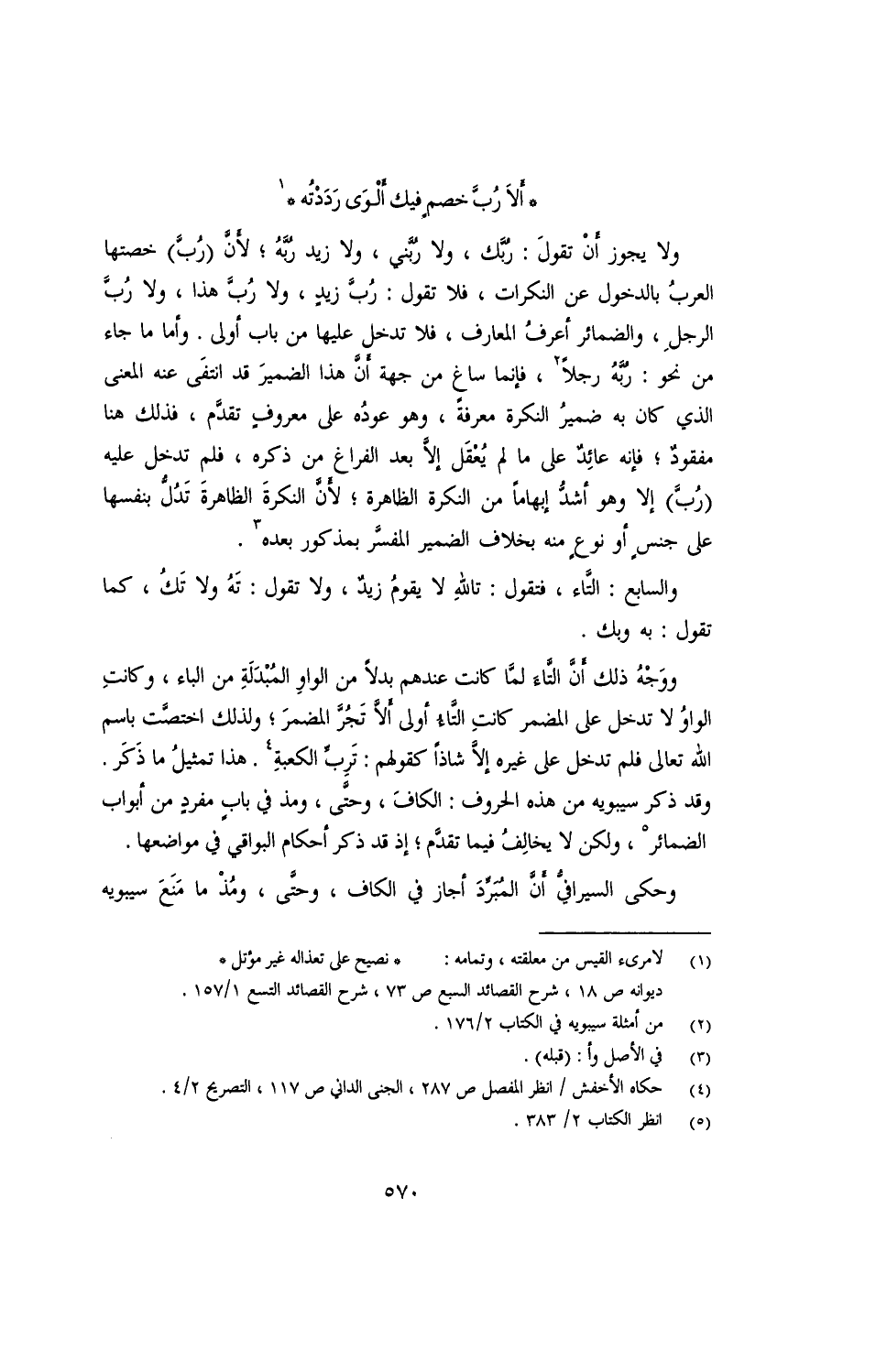 ولا يجوز أن تقول: ربك، ولا ربني، ولا زيد ربه؛ لأن (رب) خاصتها العرب بالدخول على النكرات، فلا تقول: رب زيد، ولا رب هذا، ولا رب الرجل، والضمائر أعرف المعارف، فلا تدخل عليها من باب أولى. وأما من جاء من نحو: ربه رجلًا، فإنما ساغ من جهة أن هذا الضمير قد انتفى عنه المعنى الذي كان به ضمير النكرة معرفة، وهو عودة على معروف تقدم، فذلك هنا مفقود؛ فإنه عائد على ما لم يعقل إلا بعد الفراغ من ذكره، فلم تدخل عليه (رب) إلا وهو أشد إبهامًا من النكرة الظاهرة؛ لأن النكرة الظاهرة تدل بنفسها على جنس أو نوع منه بخلاف الضمير المفسر بمذكور بعده.