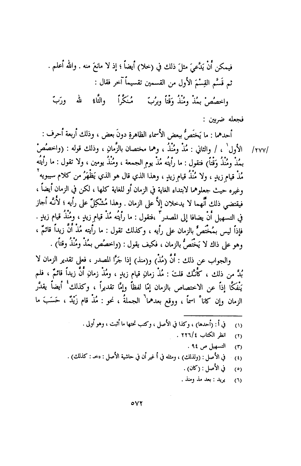 أحدهما: ما يختص ببعض الأسماء الظاهرة دون بعض، وذلك أربعة أحرف: الأول، / والثاني: مذ ومنذ، وهما مختصان بالزمان، وذلك قوله: (وأخصص يمذ ومنذ وقتًا) فتقول: ما رأيته مذ يوم الجمعة، ومنذ يومين، ولا تقول: ما رأيته مذ قيام زيد، ولا منذ قيام زيد، وهذا الذي قال هو الذي يظهر من كلام سيبويه وغيره حيث جعلوهما لابتداء الغاية في الزمان أو للغاية كلها، لكن في الزمان أيضًا، فيقتضي ذلك أنهما لا يدخلان إلا على الزمان. وهذا مشكل على رأيه؛ لأنه أجاز في التسهيل أن يضافا إلى المصدر، فتقول: ما رأيته مذ قيام زيد، ومنذ قيام زيد. فإذا ليس بمختص بالزمان على رأيه، وكذلك تقول: ما رأيته مذ أن زيدًا قائم، وهو على ذاك لا يختص بالزمان، فكيف يقول: (وأخصص بمذ ومنذ وقتًا).