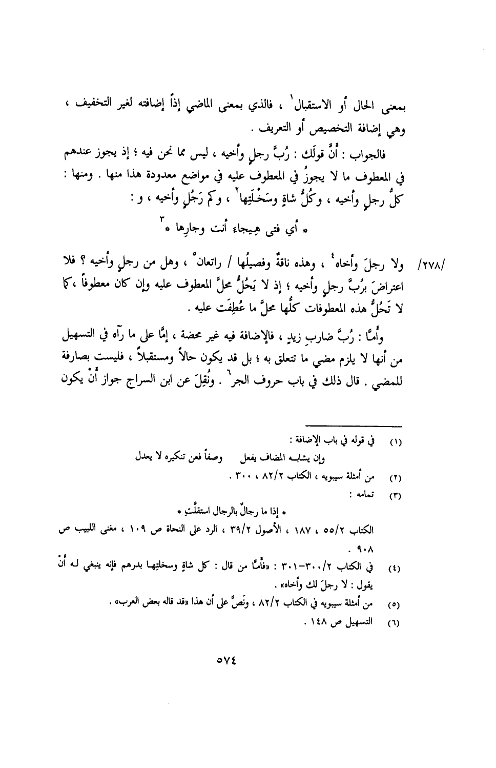 فالجواب: أن قولك: رب رجل وأخيه، ليس مما نحن فيه؛ إذ يجوز عندهم في المعطوف ما لا يجوز في المعطوف عليه في مواضع معدودة هذا منها. ومنها: كل رجل وأخيه، وكل شاة وسخلتها، وكم رجل وأخيه، و: