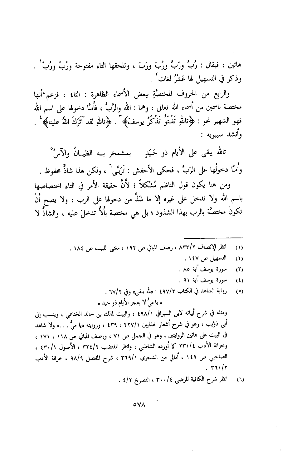 والرابع من الحروف المختصة ببعض الأسماء الظاهرة: التاء، فزعم أنها مختصة باسمين من أسماء الله تعالى، وهما: الله والرب، فأما دخولها على اسم الله فهو الشهير نحو: {تالله تفتوا تذكر يوسف}. {تالله لقد آثرك الله علينا}. وأنشد سيبويه: