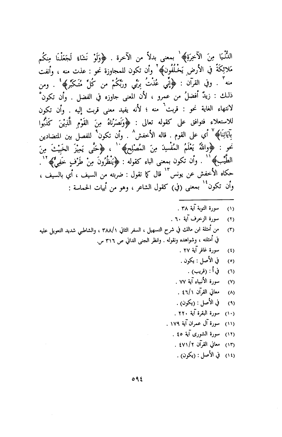 الدنيا من الآخرة} بمعنى بدلًا من الآخرة. {ولو نشأ لجعلنا منكم ملائكة في الأرض يخلفون}. وأن تكون للمجاوزة نحو: عذت منه، وأنفت منه. وفي القرآن: {إني عذت بربي وربكم من كل متكبر}. ومن ذلك: زيد أفضل من عمرو، لأن المعنى جاوزه في الفضل. وأن تكون لانتهاء الغاية نحو: قربت منه؛ لأنه يفيد معنى قربت إليه. وأن تكون للاستعلاء فتوافق على كقوله تعالى: {ونصرناه من القوم الذين كذبوا بآياتنا} أي على القوم. قاله الأخفش. وأن تكون للفصل بين المتضادين نحو: {والله يعلم المفسد من المصلح}، {حتى يميز الخبيث من الطيب}. وأن تكون بمعنى الباء كقوله: {ينظرون من طرٍف خفي}. حكاه الأخفش عن يونس قال كما تقول: ضربته من السيف، أي بالسيف، وأن تكون بمعنى (في) كقول الشاعر، وهو من أبيات الحماسة: