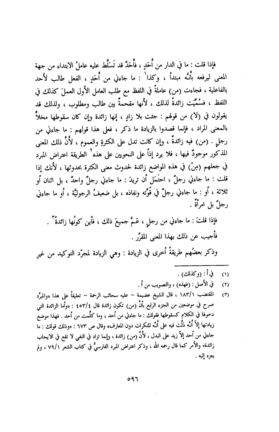فإذا قلت: ما في الدار أحٍد، فأحد قد تسلط عليه عامل الابتداء من جهة المعنى ليرفعه بأنه مبتدأ، وكذا: ما جاءني من أحٍد، الفعل طالب لأحد بالفاعلية، فجاءت (من) عاملة في اللفظ مع طلب العامل الأول العمل كذلك في اللفظ، فسميت زائدًة لذلك، لأنها مقحمة بين طالب ومطلوب، ولذلك قد يقولون في (لا) من قولهم: جئت بلا زاٍد، إنها زائدة وإن كان سقوطها مخلا بالمعنى المراد، فإنما قصدوا بالزيادة ما ذكر، فعلى هذا قولهم: ما جاءني من رجٍل. (من) فيه زائدة، وإن كانت تدل على الكثرة والعموم، لأن ذلك المعنى المذكور موجود فيها، فلا يرد إذًا على النحويين على هذه الطريقة اعتراض المبرد في جعلهم (من) في هذه المواضع زائدة لحدوث معنى الكثرة بحدوثها، لأنك إذا قلت: ما جاءني رجل، احتمل أن تريد: ما جاءني رجل واحد، بل اثنان أو ثلاثة، أو: ما جاءني رجل في قوته ونفاذه، بل ضعيف الرجولية، أو ما جاءني رجل بل امرأة.