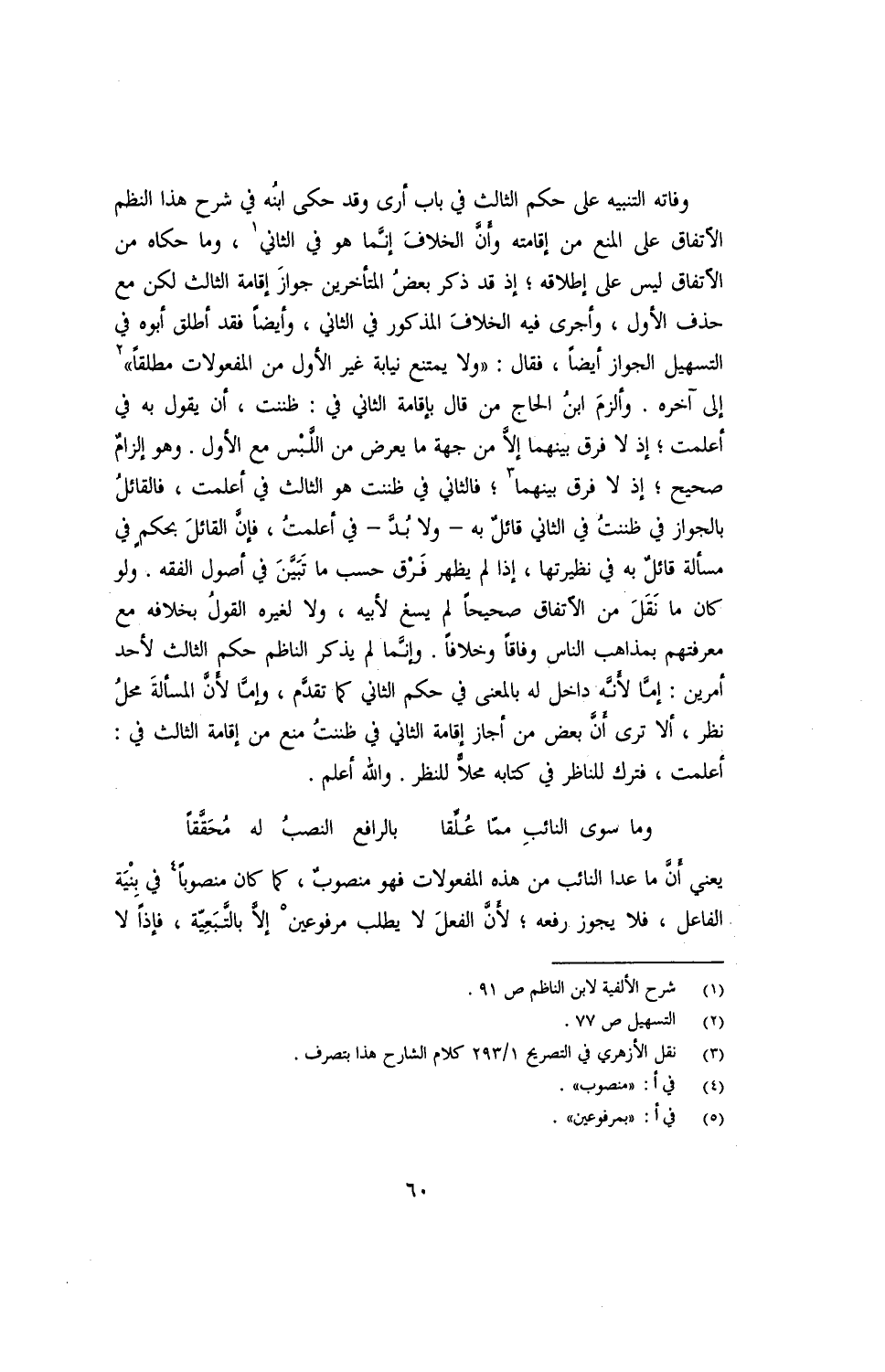 وفاته التنبيه على حكم الثالث في باب أرى وقد حكى ابنُه في شرح النظم الاتفاق على المنع من إقامته وأنّ الخلاف إنّما هو في الثاني, وما حكاه من الاتفاق ليس على إطلاقه؛ إذ قد ذكر بعض المتأخرين جواز إقامة الثالث لكن مع حذف الأول, وأجرى فيه الخلاف المذكور في الثاني, وأيضًا فقد أطلق أبوه في التسهيل الجواز أيضًا, فقال: ((ولا يمتنع نيابة غير الأول من المفعولات مطلقًا)) إلى آخره. وألزم ابن الحاج من قال بإقامة الثاني في: ظننت, أن يقول به في أعلمت؛ إذ لا فرق بينهما إلّا من جهة ما يعرض من اللّبس مع الأول. وهو إلزامٌ صحيح؛ إذ لا فرق بينهما؛ فالثاني في ظننت هو الثالث في أعلمت, فالقائل بالجواز في ظننت في الثاين قائلٌ به- ولا بد- في أعلمت, فإنّ القائل بحكم في مسألة قائلٌ به في نظيرتها, إذا لم يظهر فرْق حسب ما تبيّن في أصول الفقه. ولو كان ما نَقَلَ من الاتفاق صحيحًا لم يسغ لأبيه, ولا لغيره القولُ بخلافه مع معرفتهم بمذاهب الناس وفاقًا وخلافًا. وإنّما لم يذكر الناظم حكم الثالث لأحد أمرين: إمّا لأنّه داخل له بالمعنى في حكم الثاني كما تقدم, وإمّا لأن المسألة محلُ نظر, ألا ترى أنّ بعض من أجاز إقامة الثاني في ظننتُ منع إقامة الثالث في: أعلمت, فترك للناظر في كتابه محلًا للنظر. والله أعلم.