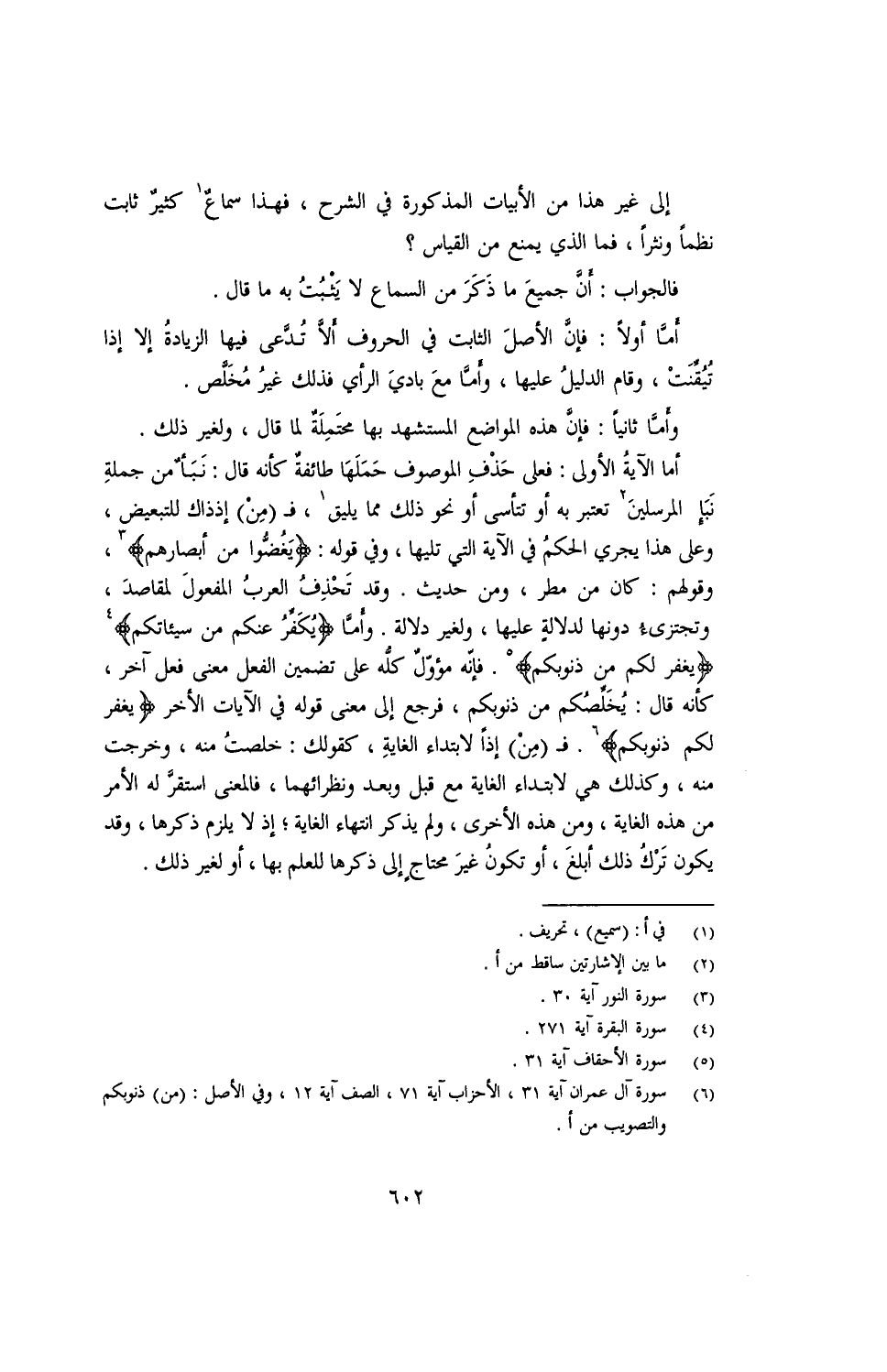 أما الآية الأولى: فعلى حذف الموصوف حملها طائفة كأن قال: نبأ من جملة نبأ المرسلين تعبر به أو تتأسى أو نحو ذلك مما يليق، فـ (من) إذذاك للتبعيض، وعلى هذا يجري الحكم في الآية التي تليها، وفي قوله: {يغضوا من أبصارهم}، وقولهم: كان من مطر، ومن حديث. وقد تحذف العرب المفعول لمقاصد، وتجتزئ دونها لدلالة عليها، ولغير دلالة. وأما {يكفر عنكم من سيئاتكم} {يغفر لكم من ذنوبكم}. فإنه مؤول كله على تضمين الفعل معنى فعل آخر، كأنه قال: يخلصكم من ذنوبكم، فرجع إلى معنى قوله في الآيات الأخر {يغفر لكم ذنوبكم}. فـ (من) إذًا لابتداء الغاية، كقولك: خلصت منه، وخرجت منه، وكذلك هي لابتداء الغاية مع قبل وبعد ونظرائهما، فالمعنى استقر له الأمر من هذه الغاية، ومن هذه الأخرى، ولم يذكر انتهاء الغاية؛ إذ لا يلزم ذكرها، وقد يكون ترك ذلك أبلغ، أو تكون غير محتاٍج إلى ذكرها للعلم بها، أو لغير ذلك.