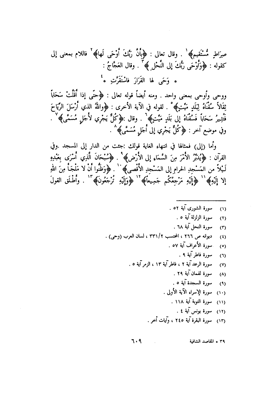 ووحى وأوحى بمعنى واحد. ومنه أيضًا قوله تعالى: {حتى إذا أقلت سحابًا ثقالًا سقناه لبلٍد ميٍت}. لقوله في الآية الأخرى: {والله الذي أرسل الرياح فتثير سحابًا فسقناه إلى بلٍد ميٍت}. وقال: {كل يجري لأجٍل مسمى}. وفي موضع آخر: {كل يجري إلى أجٍل مسمى}.