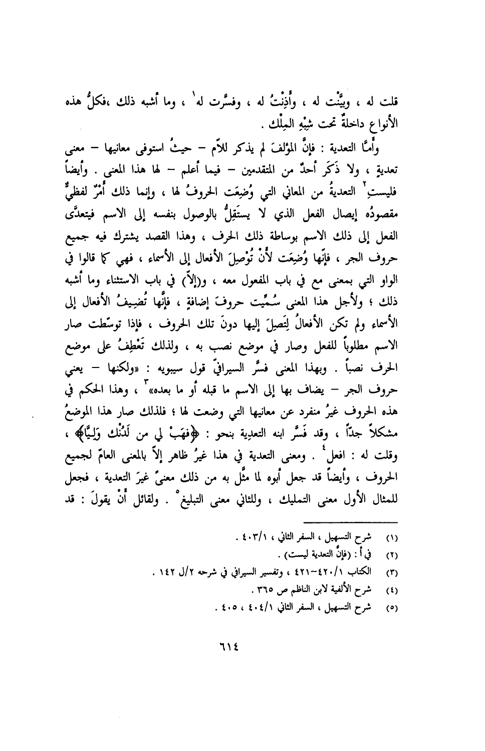 وأما التعدية: فإن المؤلف لم يذكر اللام - حيث استوفى معانيها - معنى تعديٍة، ولا ذكر أحد من المتقدمين - فيما أعلم - لها هذا المعنى. وأيضًا فليست التعدية من المعاني التي وضعت الحروف لها، وإنما ذلك أمر لفظي مقصوده إيصال الفعل الذي لا يستقل بالوصول بنفسه إلى الاسم فيتعدى الفعل إلى ذلك الاسم بوساطة ذلك الحرف، وهذا القصد يشترك فيه جميع حروف الجر، فإنها وضعت لأن توصل الأفعال إلى الأسماء، فهي كما قالوا في الواو التي بمعنى مع في باب المفعول معه، و (إلا) في باب الاستثناء وما أشبه ذلك؛ ولأجل هذا المعنى سميت حروف إضافٍة، فإنها تضيف الأفعال إلى الأسماء ولم تكن الأفعال لتصل إليها دون تلك الحروف، فإذا توسطت صار الاسم مطلوبًا للفعل وصار في موضع نصب به، ولذلك تعطف على موضع الحرف نصبًا. وبهذا المعنى فسر السيرافي قول سيبويه: "ولكنها - يعني حروف الجر - يضاف بها إلى الاسم ما قبله أو ما بعده"، وهذا الحكم في هذه الحروف غير منفرد عن معانيها التي وضعت لها؛ فلذلك صار هذا الموضع مشكلًا جدًا، وقد فسر ابنه التعدية بنحو: {فهب لي من لدنك وليا}، وقلت له: افعل. ومعنى التعدية في هذا غير ظاهر إلا بالمعنى العام لجميع الحروف، وأيضًا قد جعل أبوه لما مثل به من ذلك معنى غير التعدية، فجعل للمثال الأول معنى التمليك، وللثاني معنى التبليغ. ولقائل أن يقول: قد