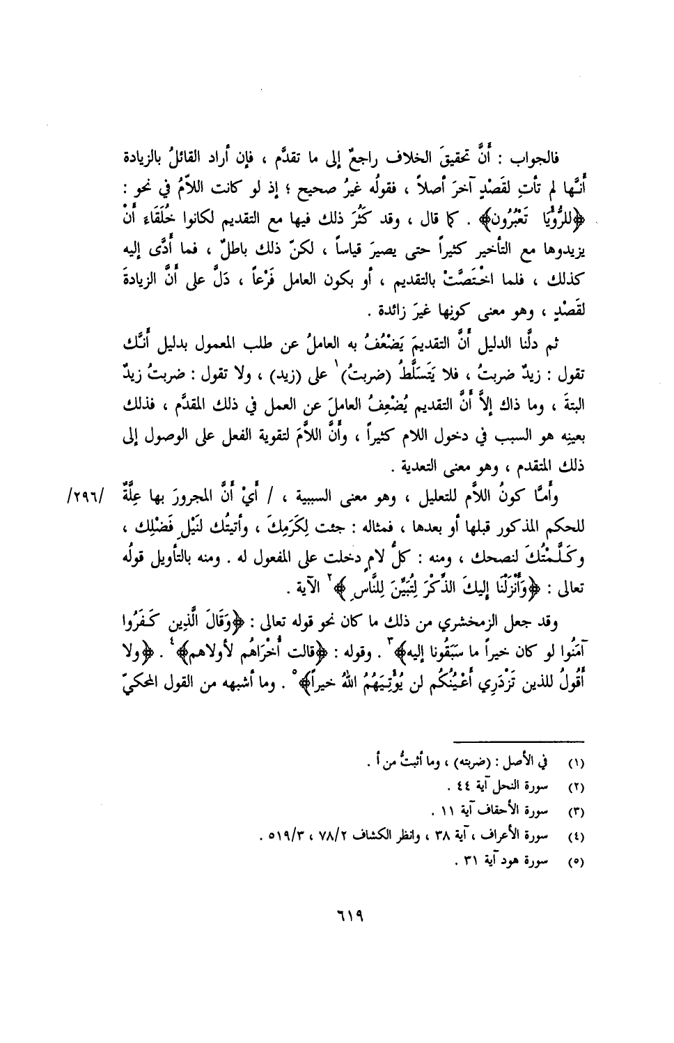 فالجواب: أن تحقيق الخلاف راجع إلى ما تقدم، فإن أراد القائل بالزيادة أنها لم تأت لقصٍد آخر أصلًا، فقوله غير صحيح؛ إذ لو كانت اللام في نحو: {للرؤيا تعبرون}. كما قال، وقد كثر ذلك فيها مع التقدم لكانوا خلقاء أن يزيدوها مع التأخير كثيرًا حتى يصير قياسًا، لكن ذلك باطل، فما أدى إليه كذلك، فلما اختصت بالتقديم، أو بكون العامل فرعًا، دل على أن الزيادة لقصٍد، وهو معنى كونها غير زائدة.