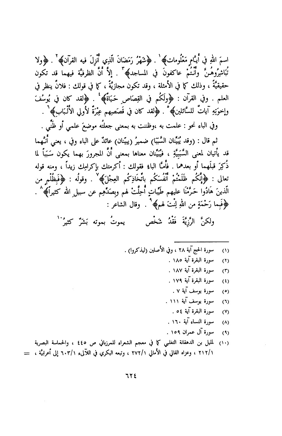 اسم الله في أياٍم معلومات}. {شهر رمضان الذي أنزل فيه القرآن}. {ولا تباشروهن وأنتم عاكفون في المساجد}. إلا أن الظرفية فيهما قد تكون حقيقية، وذلك كما في الأمثلة، وقد تكون مجازية، كما في قولك: فلان ينظر في العلم. وفي القرآن: {ولكم في القصاص حياة}. {لقد كان في يوسف وإخوته آيات للسائلين}. {لقد كان في قصصهم عبرة الأولي الألباب}. وفي الباء نحو: علمت به، وظننت به بمعنى جعلته موضع علمي أو ظني.