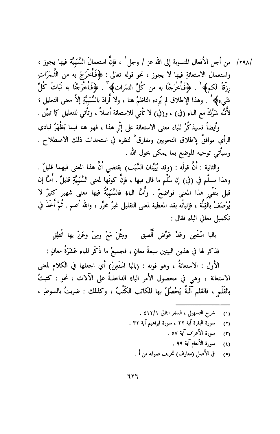 من أجل الأفعال المنسوبة إلى الله عز/ وجل، فإن استعمال السببية فيها يجوز، واستعمال الاستعانة فيها لا يجوز، نحو قوله تعالى: {فأخرج به من الثمرات رزقًا لكم}. {فأخرجنا به من كل الثمرات}. {فأخرجنا به نبات كل شيء}. وهذا الإطلاق لم يرده الناظم هنا، ولا أراد بالسببية إلا معنى التعليل؛ لأنه شرك مع الباء (في)، و (في) لا تأتي للاستعانة أصلاً، وتأتي للتعليل كما تبين.