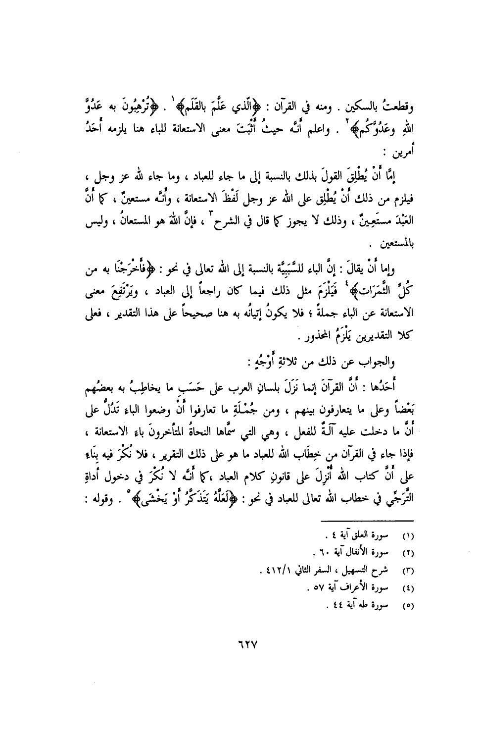 أحدها: أن القرآن إنما نزل بلسان العرب على حسب ما يخاطب به بعضهم بعضًا وعلى ما يتعارفون بينهم، ومن جملة ما تعارفوا أن وضعوا الباء تدل على أن ما دخلت عليه آلة للفعل، وهي التي سماها النحاة المتأخرون باء الاستعانة، فإذا جاء في القرآن من خطاب الله للعباد ما هو على ذلك التقرير، فلا نكر فيه بناء على أن كتاب الله أنزل على قانون كلام العباد، كما أنه لا نكر في دخول أداة الترجي في خطاب الله تعالى للعباد في نحو: {لعلة يتذكر أو يخشى}. وقوله: