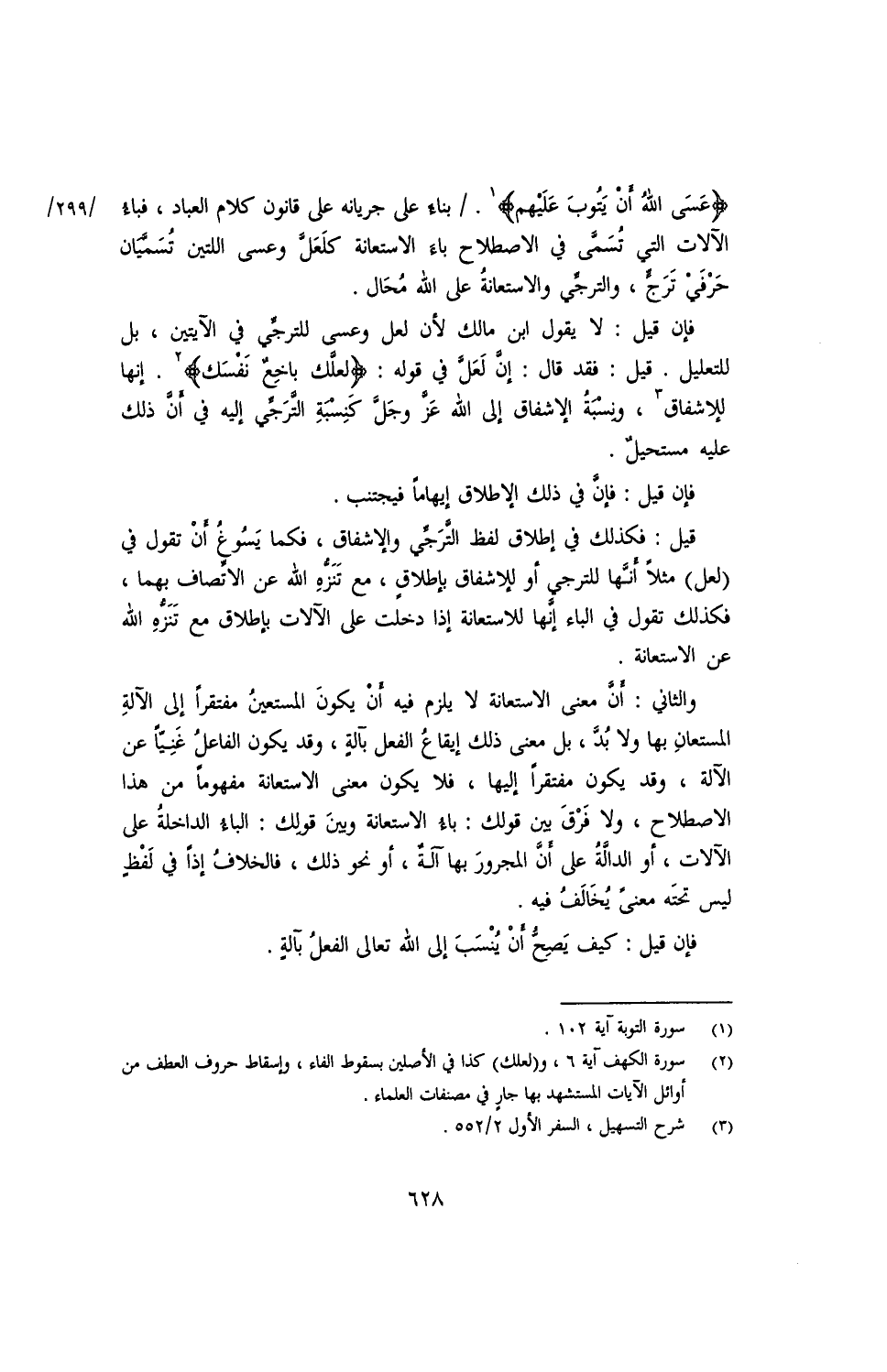 فإذا قيل: لا يقول ابن مالك لأن لعل وعسى للترجي في الآيتين، بل للتعليل. قيل: فقد قال: إن لعل في قوله: {لعلك باخع نفسك}. إنها للإشفاق، ونسبة الإشفاق إلى الله عز وجل كنسبة الترجي إليه في أن ذلك عليه مستحيل.