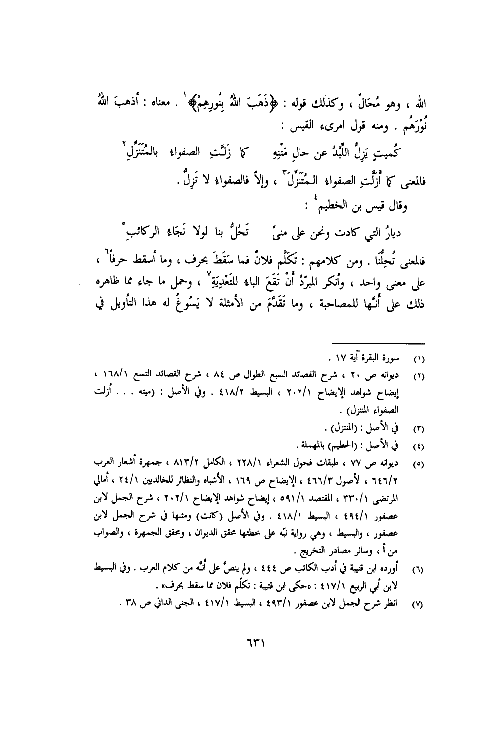 الله، وهو محال، وكذلك قوله: {ذهب الله بنورهم}. معناه: أذهب الله نورهم. ومنه قول امرئ القيس: