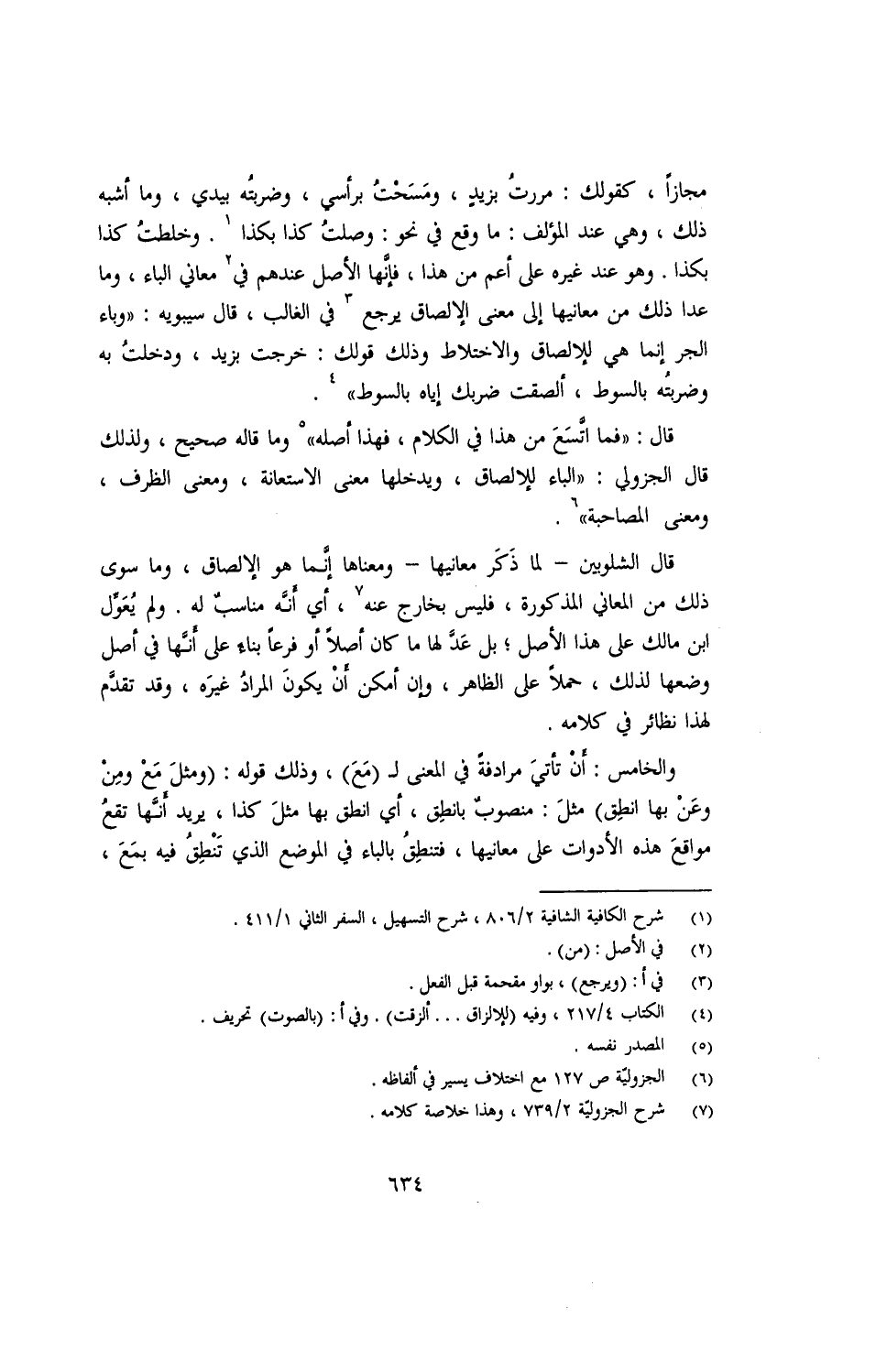 قال: "فما اتسع من هذا في الكلام، فهذا أصله" وما قاله صحيح، ولذلك قال الجزولي: "الباء للإلصاق، ويدخلها معنى الاستعانة، ومعنى الظرف، ومعنى المصاحبة".