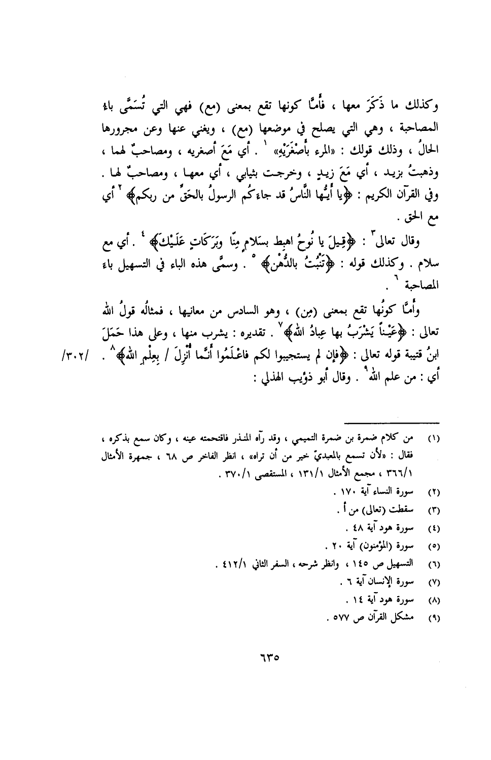 وقال تعالى: {قيل يا نوح اهبط بسلاٍم منا وبركاٍت عليك}. أي مع سلام. وكذلك قوله: {تنبت بالدهن}. وسمى هذه الباء في التسهيل باء المصاحبة.