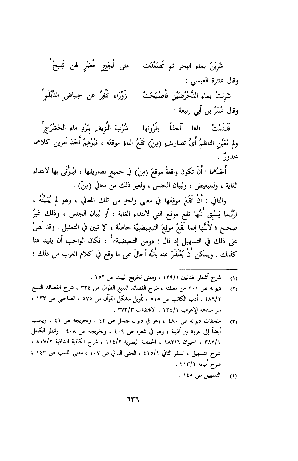 أحدهما: أن تكون واقعة موقع (من) في جميع تصاريفها، فيوتى بها لابتداء الغاية، وللتبعيض، ولبيان الجنس، ولغير ذلك من معاني (من).
