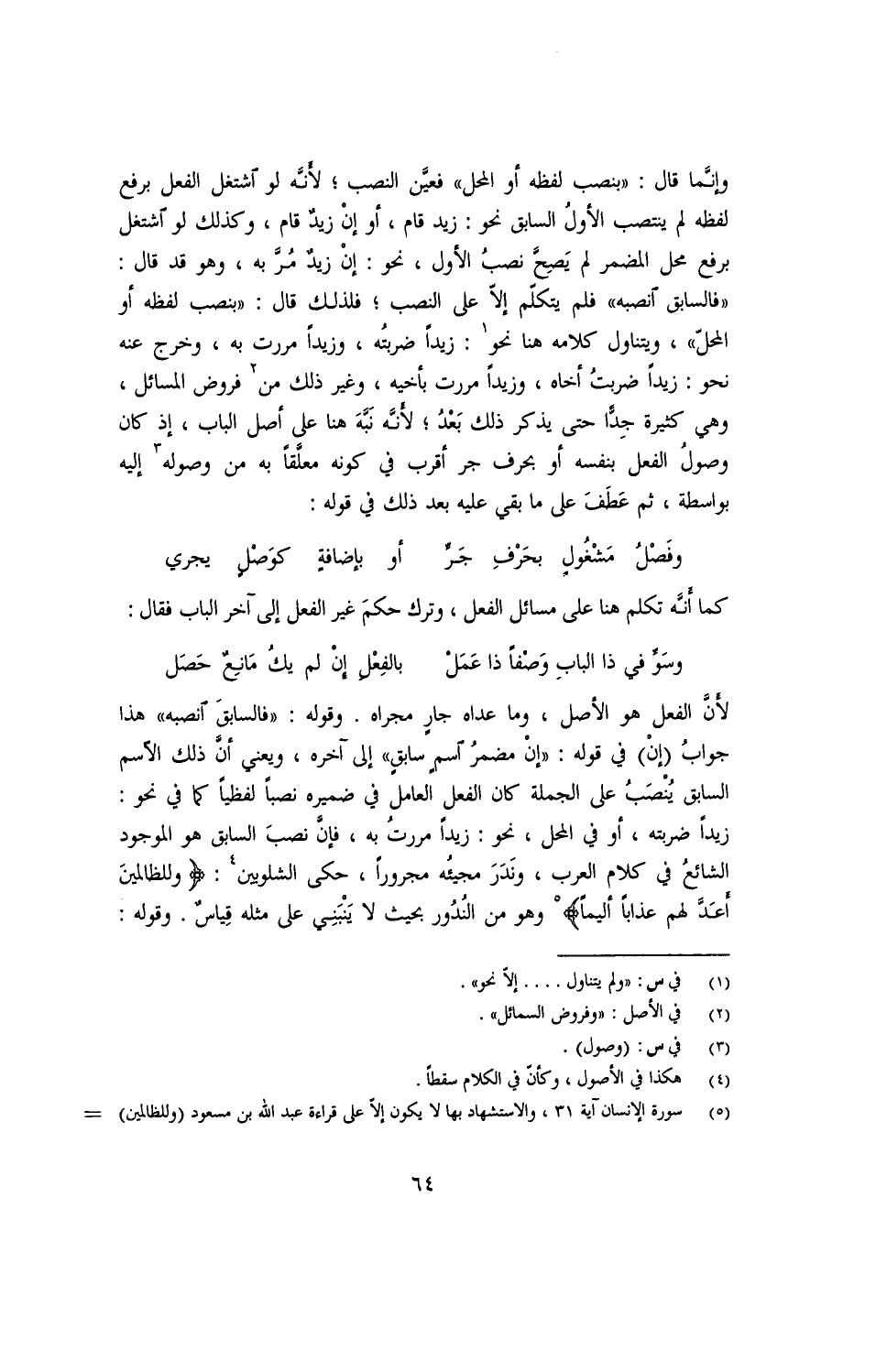 لأنّ الفعل هو الأصل, وما عداه جارٍ مجراه. وقوله: ((فالسابق انصبه)) هذا جواب (إنْ) في قوله: ((إن مضمر اسم سابقٍ)) إلى آخره, ويعني أنّ ذلك الاسم السابق ينصبُ على الجملة كان الفعل العامل ضميره نصبًا لفظيًا كما في نحو: زيدًا ضربته, أو في المحل, نحو: زيدًا مررتُ به, فإنّ نصبَ السابق هو الموجود الشائع في كلام العرب, وندَرَ مجيئه مجرورًا, وحكى الشلويين: {وللظالمينَ أعدَّ لهم عذابًا أليمًا} وهو من النُذور بحيث لا يَنْبَني على مثله قياسٌ. وقوله: