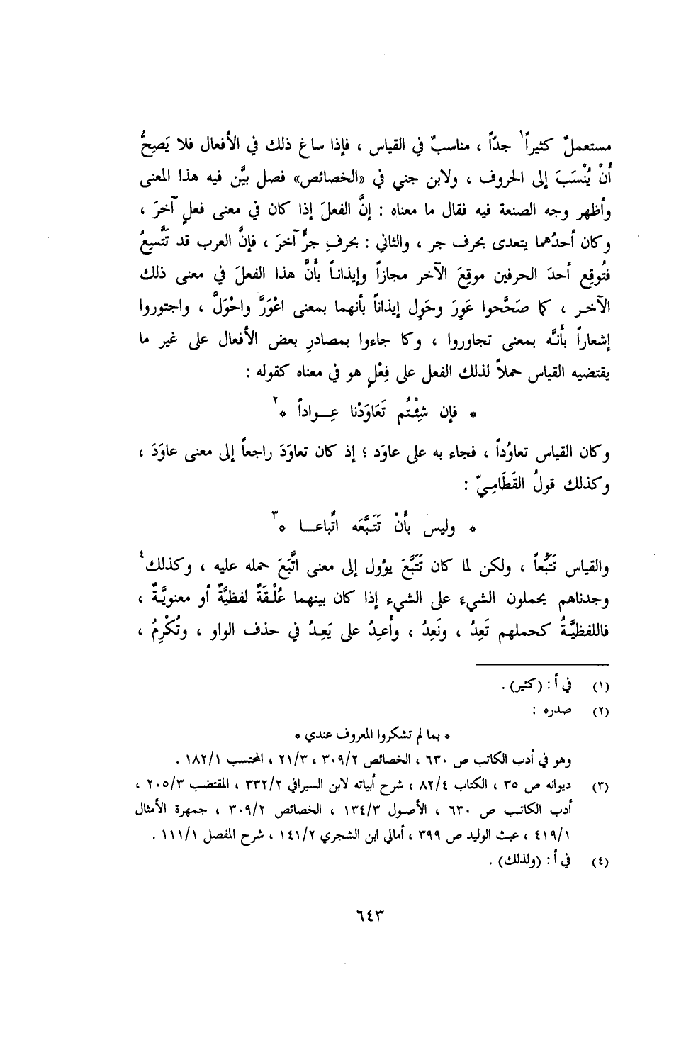 مستعمل كثيرًا جدًا، مناسب في القياس، فإذا ساغ ذلك في الأفعال فلا يصح أن ينسب إلى الحروف، ولابن جني في "الخصائص" فصل بين فيه هذا المعنى وأظهر وجه الصنعة فيه فقال ما معناه: إن الفعل إذا كان في معنى فعٍل آخر، وكان أحدهما يتعدى بحرف جر، والثاني: بحرف جر آخر، فإن العرب قد تتسع فتوقع أحد الحرفين موقع الآخر مجازًا وإيذانًا بأن هذا الفعل في معنى ذلك الآخر، كما صححوا عور وحول إيذانًا بأنهما بمعنى أعور وأحول، واجتوروا إشعارًا بأنه بمعنى تجاوروا، وكان جاءوا بمصادر بعض الأفعال على غير ما يقتضيه القياس حملًا لذلك الفعل على فعٍل هو في معناه كقوله: