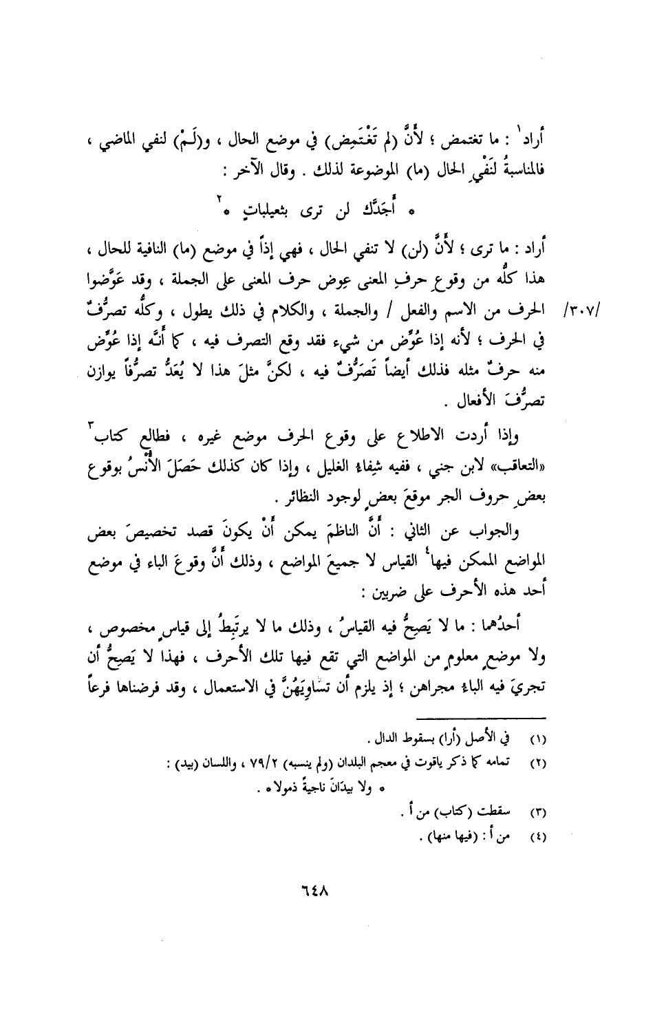 أراد: ما ترى؛ لأن (لن) لا تنفي الحال، فهي إذًا في موضع (ما) النافية للحال، هذا كله من وقوع حرف المعنى عوض حرف المعنى على الجملة، وقد عوضوا الحرف من الاسم والفعل/ والجمل، والكلام في ذلك يطول، وكله تصرف في الحرف؛ لأنه إذا عوض من شيء فقد وقع التصرف فيه، كما أنه إذا عوض منه حرف مثله فذلك أيضًا تصرف فيه، لكن مثل هذا لا يعد تصرفًا يوازن تصرف الأفعال.