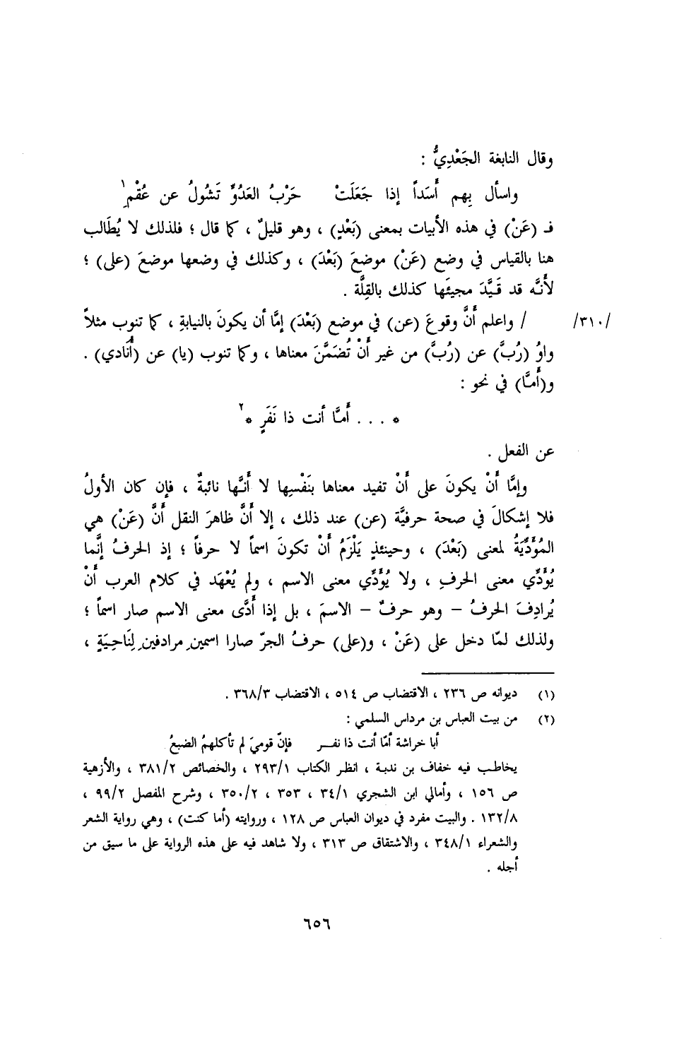 / وأعلم أن وقوع (عن) في موضع (بعد) إما أن يكون بالنيابة، كما تنوب مثلًا واو (رب) عن (رب) من غير أن تضمن معناها، وكما تنوب (يا) عن (أنادي).