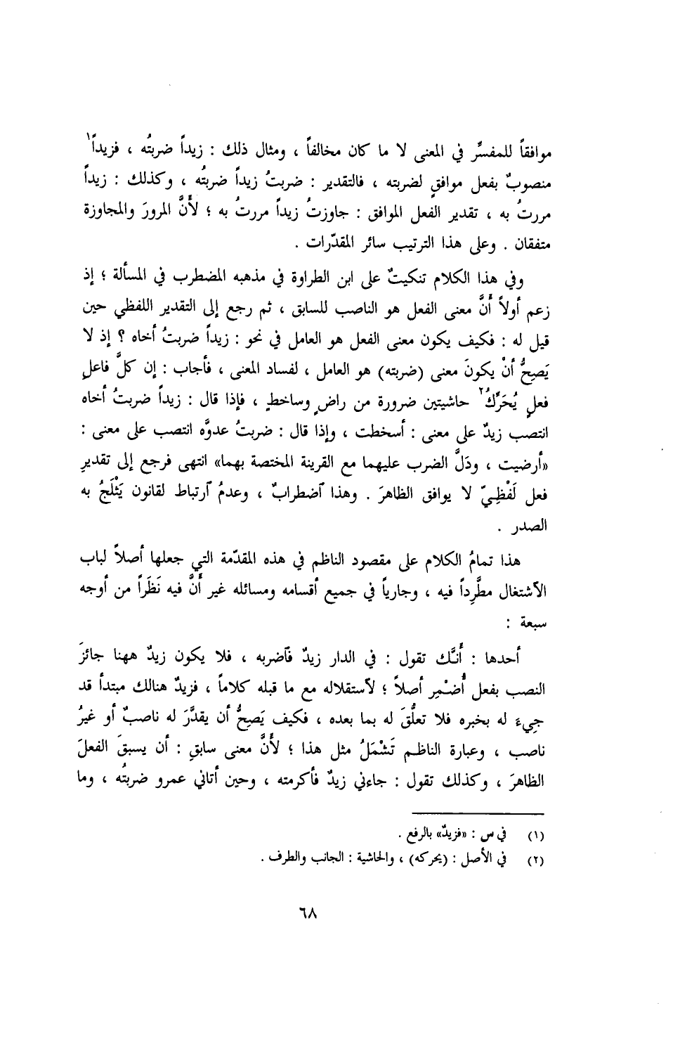 وفي هذا الكلام تنكيتٌ على ابن الطراوة في مذهبه المضطرب في المسألة؛ إذ زعم أولًا أنّ معنى الفعل هو الناصب للسابق, ثم رجع إلى التقدير اللفظي حين قيل له: فكيف يكون معنى الفعل هو العامل في نحو: زيدًا ضربتُ أخاه؟ إذ لا يصحّ أن يكون معنى (ضربته) هو العامل, لفساد المعنى, فأجاب: إن كلّ فاعلِ فعلٍ يُحرك حاشيتين ضرورة من راضٍ وساخطٍ, فإذا قال: زيدًا ضربتُ أخاه انتصب زيد على معنى: أسخطت, وإذا قال: ضربتُ عدوّه انتصب على معنى: ((أرضيت, ودلّ الضرب عليها مع القرينة المختصة بهما)) انتهى فرجع إلى تقدير فعل لفظيّ لا يوافق الظاهر. وهذا اضطرابٌ, وعدمُ ارتباط لقانون يثلَجُ به الصدر.