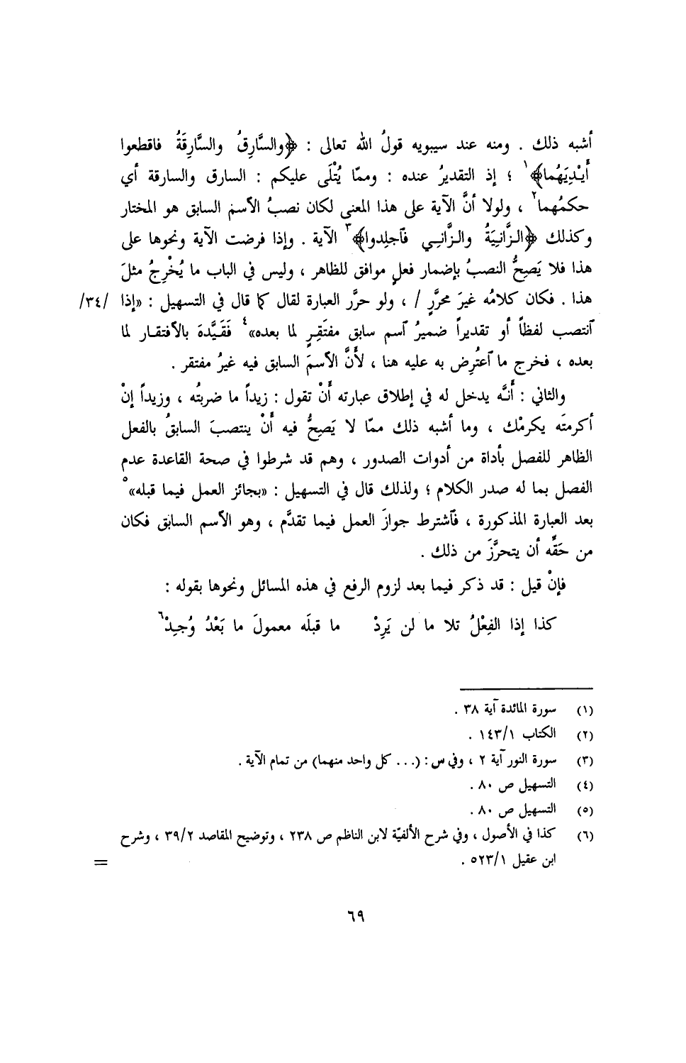 أشبه ذلك. ومنه عند سيبويه قولُ الله تعالى: {والسارقُ والسّارقةُ فاقطعوا أيدِيَهُما}؛ إذ التقدير عنده: ومما يُتلى عليكم: السارق والسارقة أي حكمُهما, ولولا أنّ الآية على هذا المعنى لكان نصب الاسم السابق هو المختار وكذلك {والزانيةُ والزّاني فاجلدوا} الآية. وإذا فرضت الآية ونحوهما على هذا فلا يصحّ النصب بإضمار فعلٍ موافق للظاهر, وليس في الباب ما يُخرجُ مثل هذا. فكان كلامه غير محرّر/, ولو حرّر العبارة لقال كما قال في التسهيل: ((إذا انتصب لفظًا أو تقديرًا ضميرُ اسم سابق مفتقر لما بعده)) فقيّده بالافتقار لما بعده, فخرج ما اعترض به عليه هنا, لأنّ الاسم السابق فيه غيرُ مفتقر.