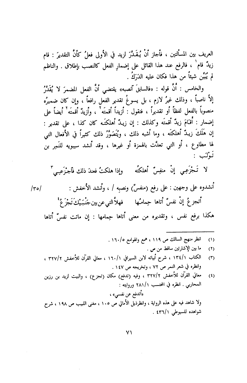 والخامس: أنّ قوله: ((فالسابق انصبه)) يقتصي أنّ الفعل المضمر لا يقدّر إلا ناصبًا, وذلك غير لازم, بل يسوغ تقدير الفعل رافعًا, وإنْ كان ضميره منصوبًا بالفعل لفظًا أو تقديرًا, فتقول: أزيدًا أقمته, وأزيدٌ أقمته أيضًا على إضمار: أقامَ زيدٌ أقمته وكذلك: إن زيدٌ أهلكته كان كذا, على تقدير: إن هلك زيدٌ أهلكته, وما أشبه ذلك, ويتصوّر ذلك كثيرًا في الأفعال التي لها مطاوع, أو التي تعدّت بالهمزة أو غيرها, وقد أنشد سيبويه للنمر بن تَوْلَب: