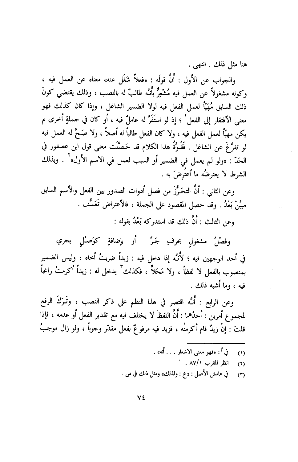 وعن الرابع: أنّه اقتصر في هذا النظم على ذكر النصب, وترَكَ الرفع لمجموع أمرين: أحدهما: أنّ اللفظ لا يختلف فيه مع تقدير الفعل أو عدمه, فإذا قلت: إنْ زيدٌ قام أكرمتُه, فزيد فيه مرفوعٌ بفعل مقدّر وجوبًا, ولو زال موجبُ